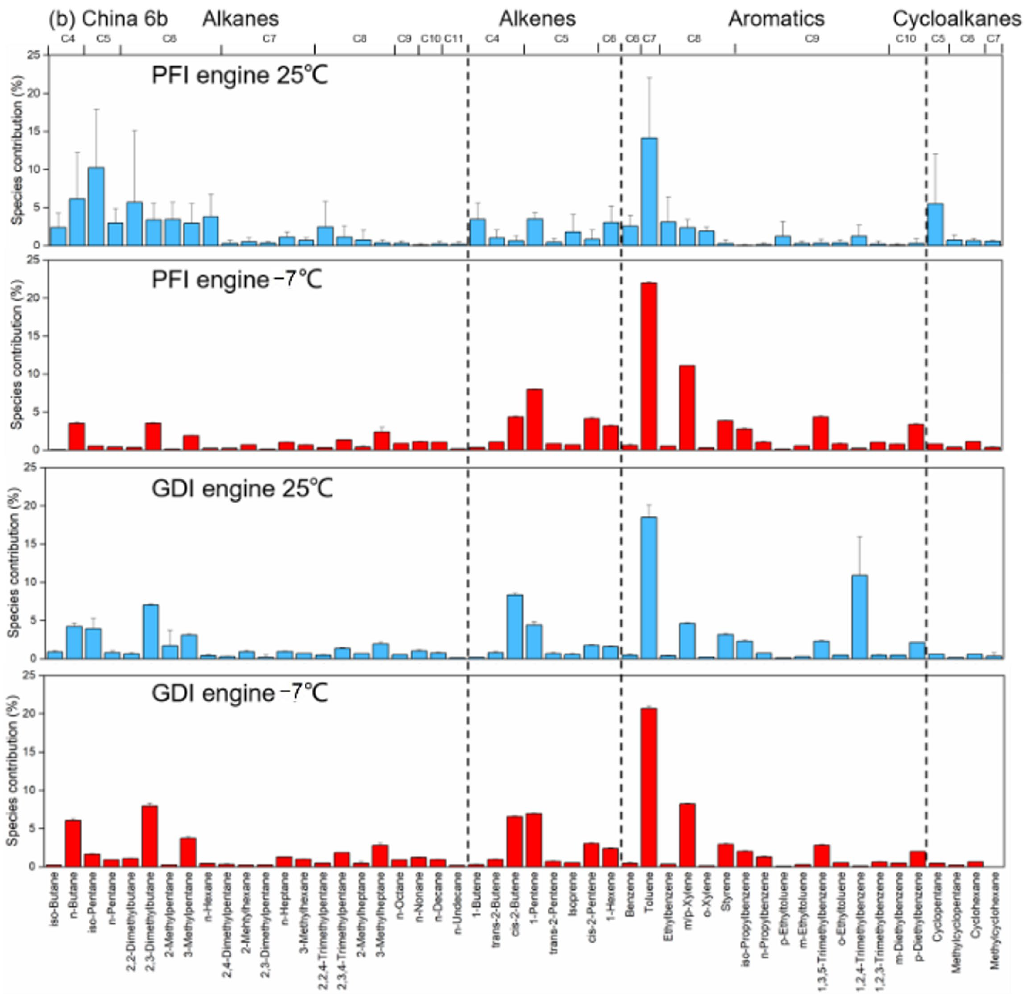 Previous studies have reported dramatic increases in vehicle emissions, including black carbon, under low ambient temperatures for both GDI and PFI vehicles. To explore the impact of ambient temperatures on VOC emissions, both two vehicles were further operated at −7 °C under the WLTC. As shown in
