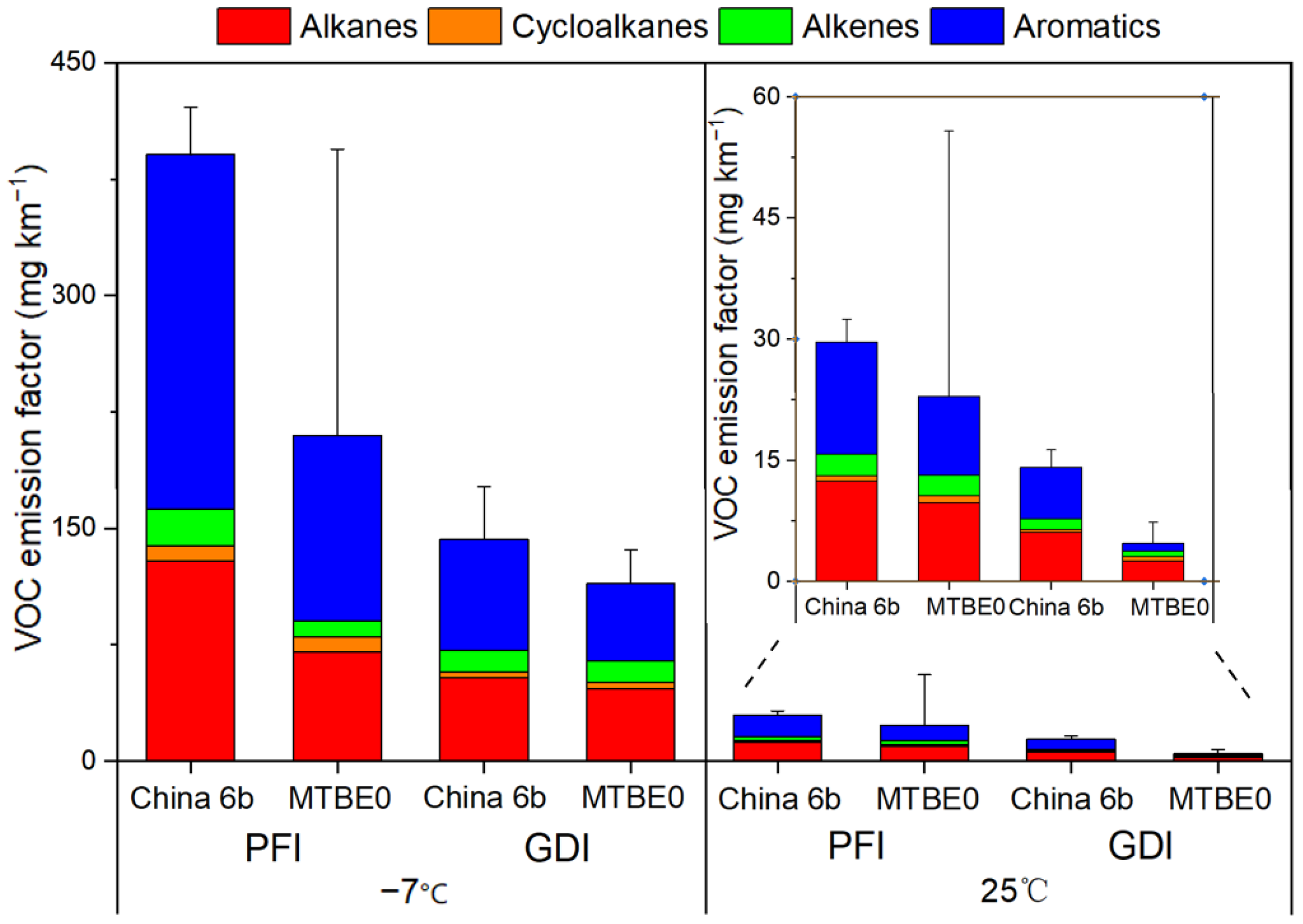 Figure 3, ambient temperature emerged as the most influential factor affecting VOC exhaust emissions among all variables studied in this work. Specifically, VOC emissions increased by a factor of 11 ± 3 for PFI engine vehicles and 10 ± 1 for GDI vehicles under low-temperature conditions. This pronounced enhancement can be primarily attributed to combustion deterioration at low temperatures. The reduced clearance between the cylinder and piston impedes flame propagation, while the colder cylinder wall promotes increased flame quenching of fuel droplets [