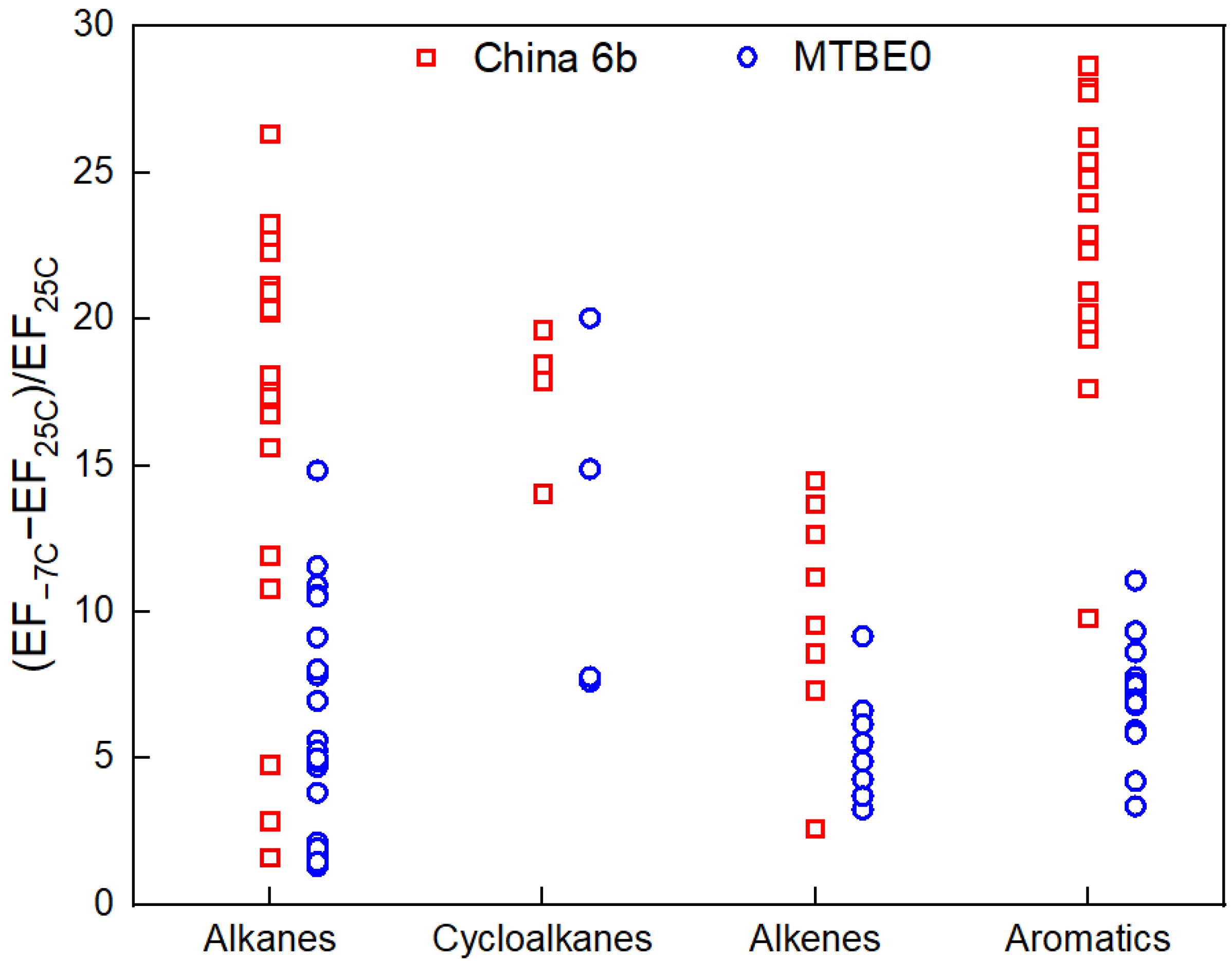 Figure 4 illustrates the relative changes in VOC emissions by chemical group between 25 °C and −7 °C during WLTC phase 1 (cold-start). Alkanes exhibited the widest range of relative changes among all groups. When using China 6b fuel, alkane emissions during the WLTC phase increased by an average factor of 17 ± 8 (ranging from 0 to 24), while with MTBE0 fuel, the increase averaged 7 ± 5 (ranging from 1 to 17). In contrast, aromatic compounds showed the highest magnitude of enhancement increasing by 24 ± 5 times with China 6b fuel and 8 ± 2 times with MTBE0 fuel. BTEX species were the dominant contributors within this group, with