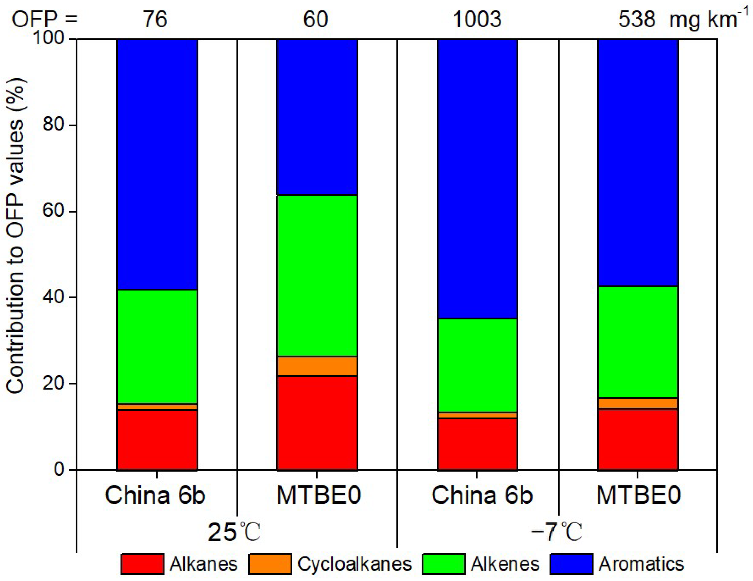 −1, respectively. The general trend showed lower ΣOFPs for MTBE0 fuel compared to China 6b, consistent with its lower VOC emissions. However, the influence of fuel type on OFP was less pronounced than that of temperature. The average OFP value at −7 °C is 13.1 times higher than at 25 °C for China 6b fuel and 9.0 times higher for MTBE0 fuel, reflecting the same pattern observed for VOC emission factors across temperatures. The OFP values estimated in this study are similar to reported on-road measurement of LDGVs in China (70.7 mg O