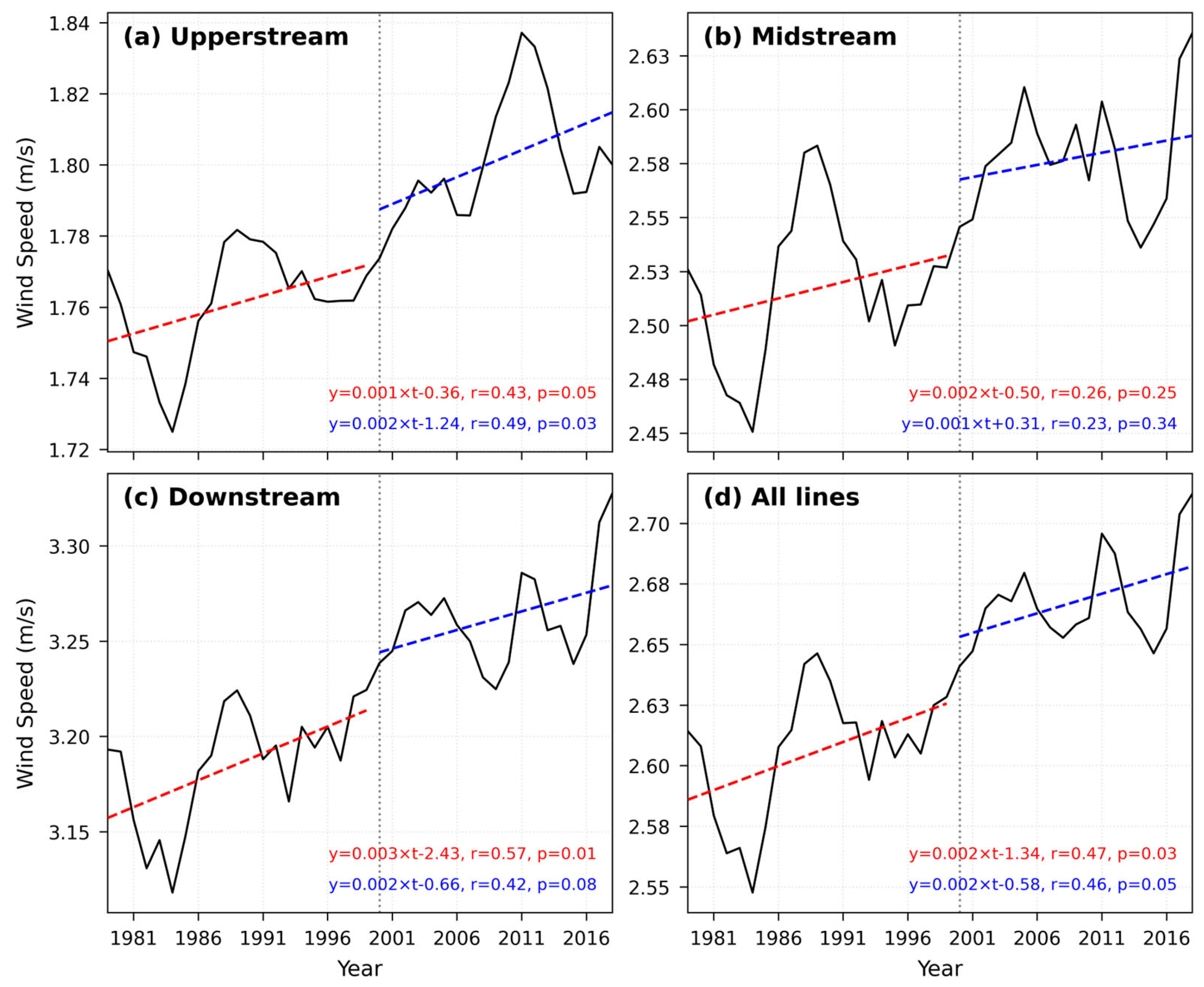 3.1. Long-Term Trend and Decadal Turning Point of Wind Speed