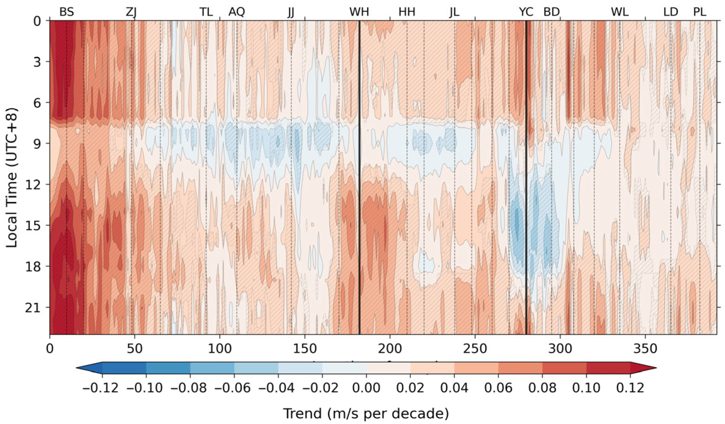 3.3.3. Diurnal and Spatial Patterns of Long-Term Wind Speed Trends