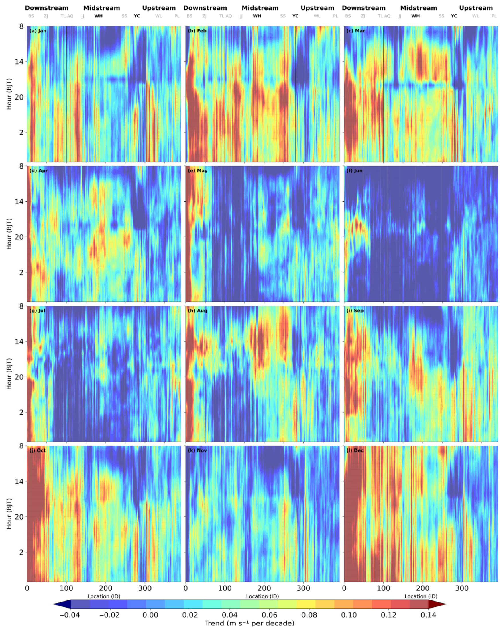 3.3.4. Spatiotemporal Patterns of Monthly and Diurnal Wind Speed Trends