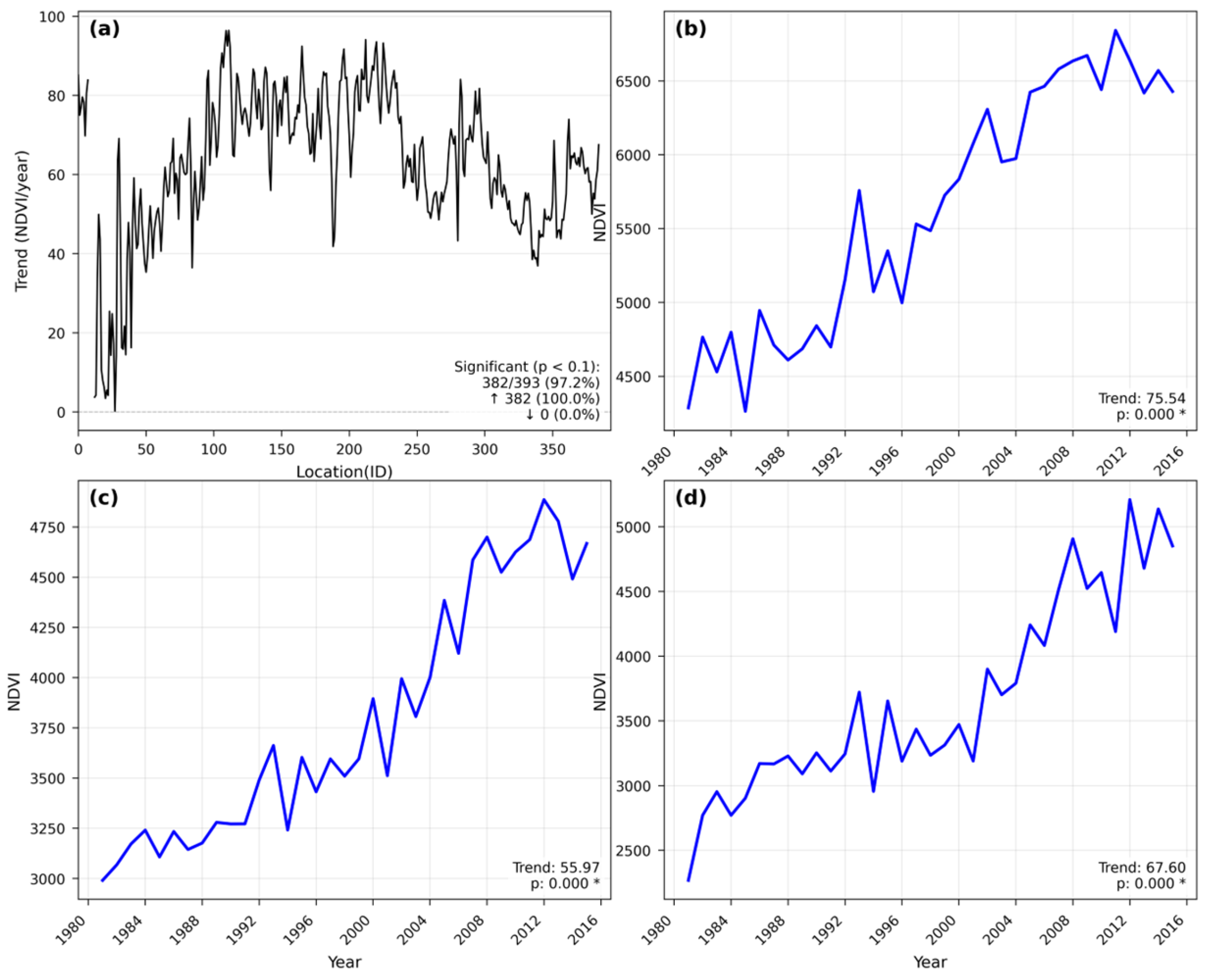 - Pinzon, J.E.; Tucker, C.J. A non-stationary 1981–2012 AVHRR NDVI3g time series. Remote Sens. 2014, 6, 6929–6960. [Google Scholar] [CrossRef]