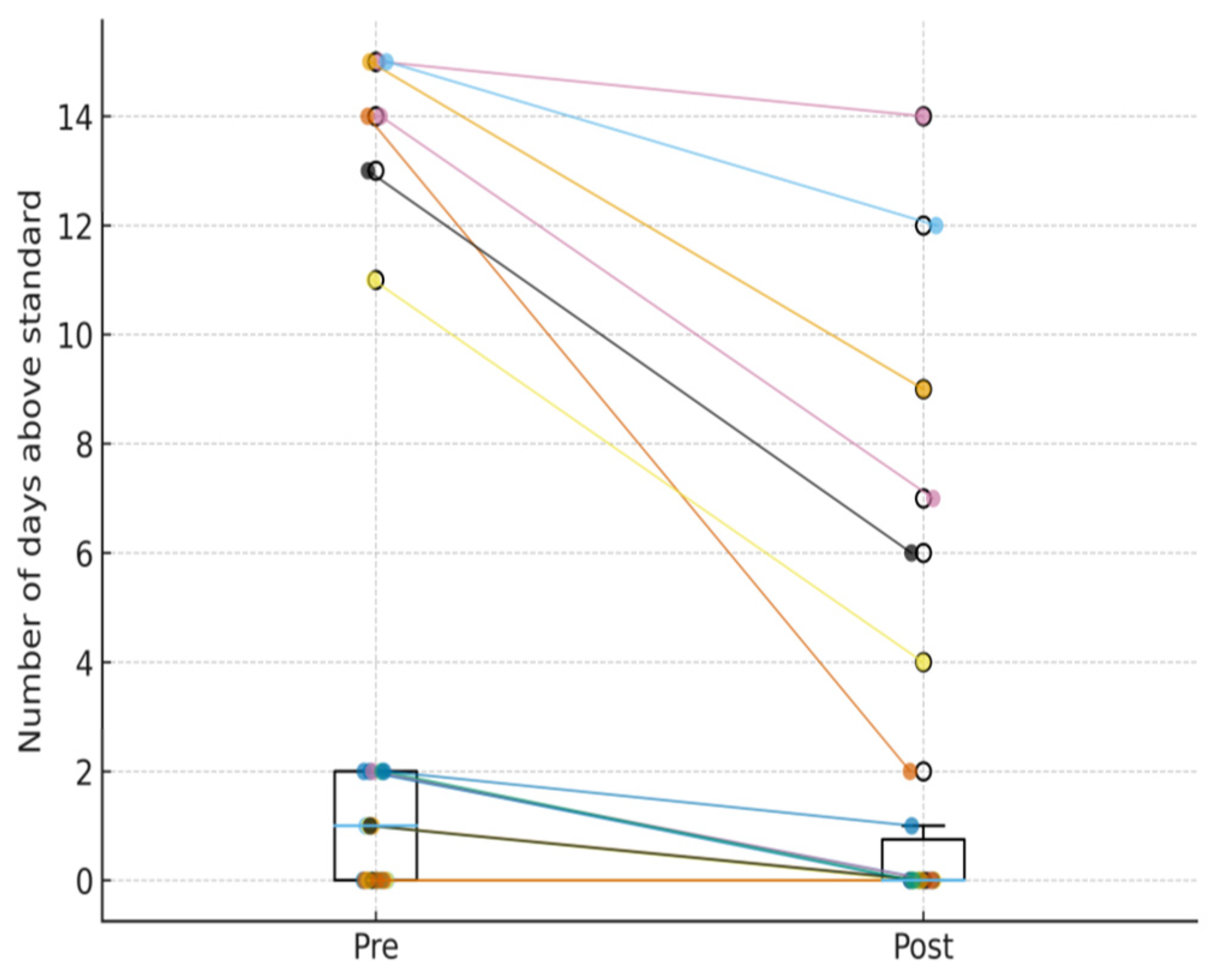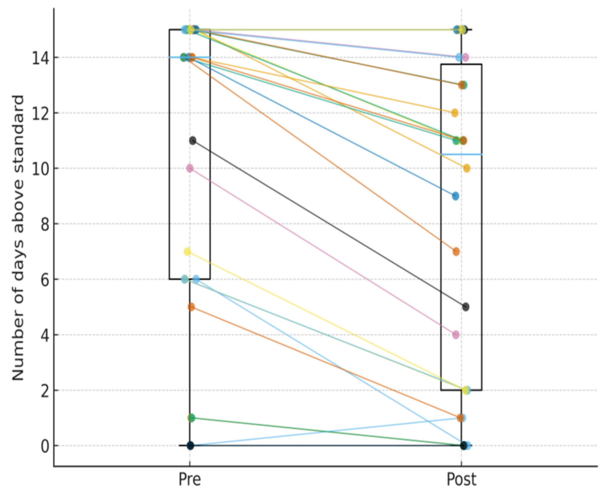 Exceedances of the EPA PM2.5 standard (35 µg/m3) were less frequent at baseline. The mean number of exceedance days decreased from 3.7 ± 5.8 days pre-intervention to 1.8 ± 3.8 days post-intervention (Figure 2), representing a mean change of 1.9 days (p = 0.001). Overall, 16 participants (53.3%) experienced a reduction in exceedance days relative to the EPA standard. Although baseline exceedances were less common, the paired trajectories demonstrate consistent reductions across most participant households.