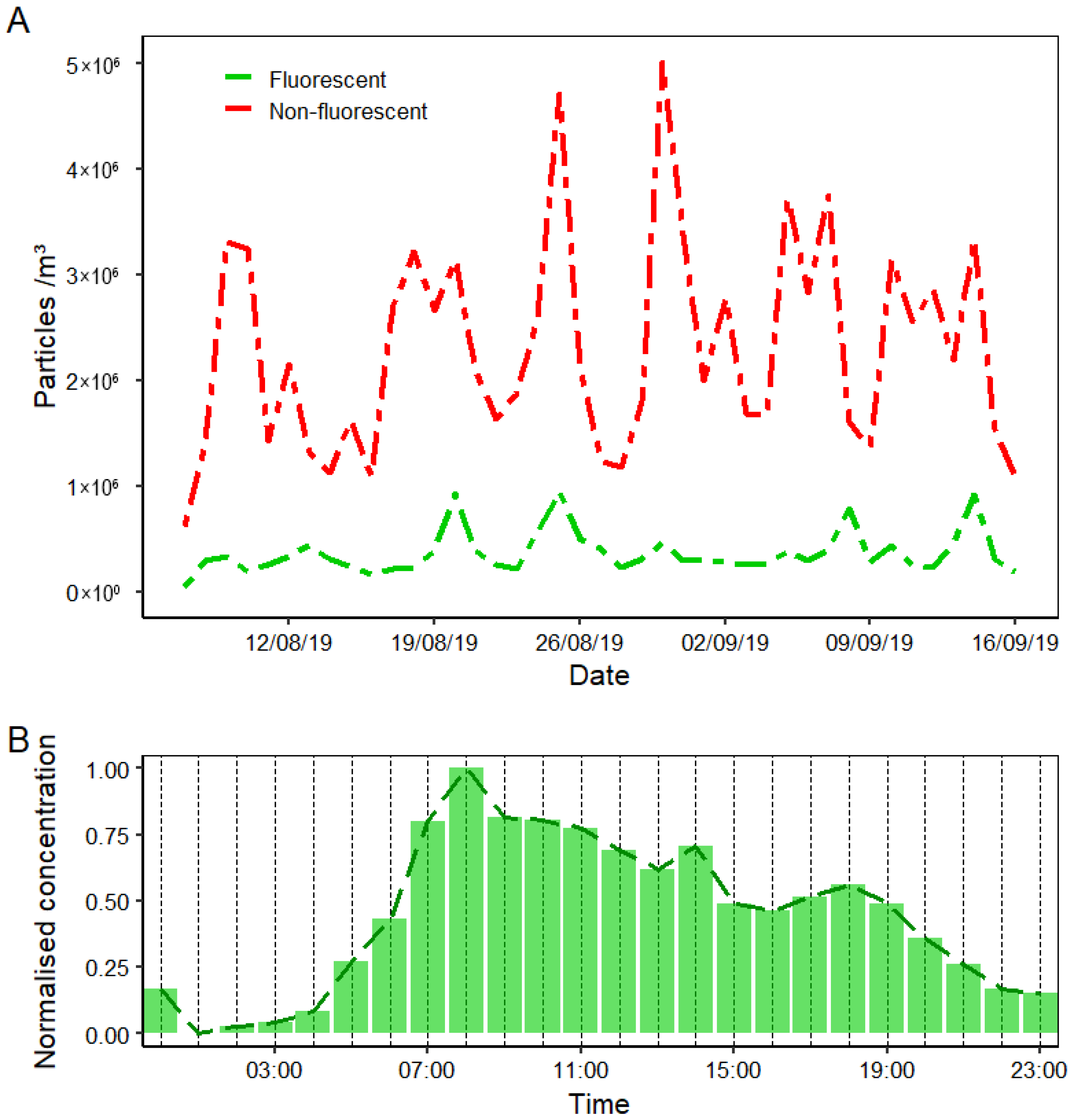 - Healy, D.A.; Huffman, J.A.; O’Connor, D.J.; Pöhlker, C.; Pöschl, U.; Sodeau, J.R. Ambient measurements of biological aerosol particles near Killarney, Ireland: A comparison between real-time fluorescence and microscopy techniques. Atmos. Chem. Phys. 2014, 14, 8055–8069. [Google Scholar] [CrossRef]