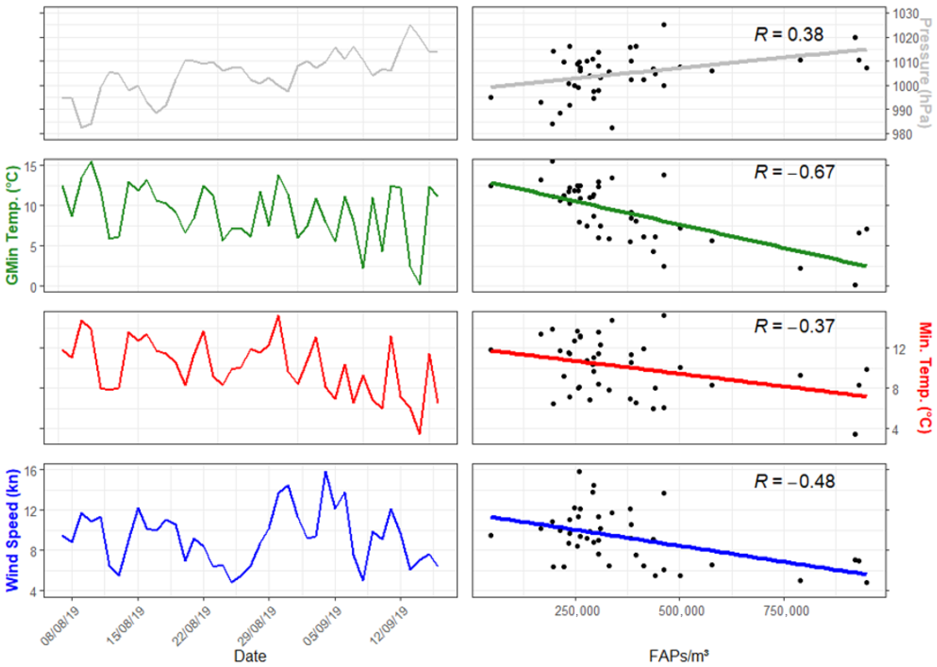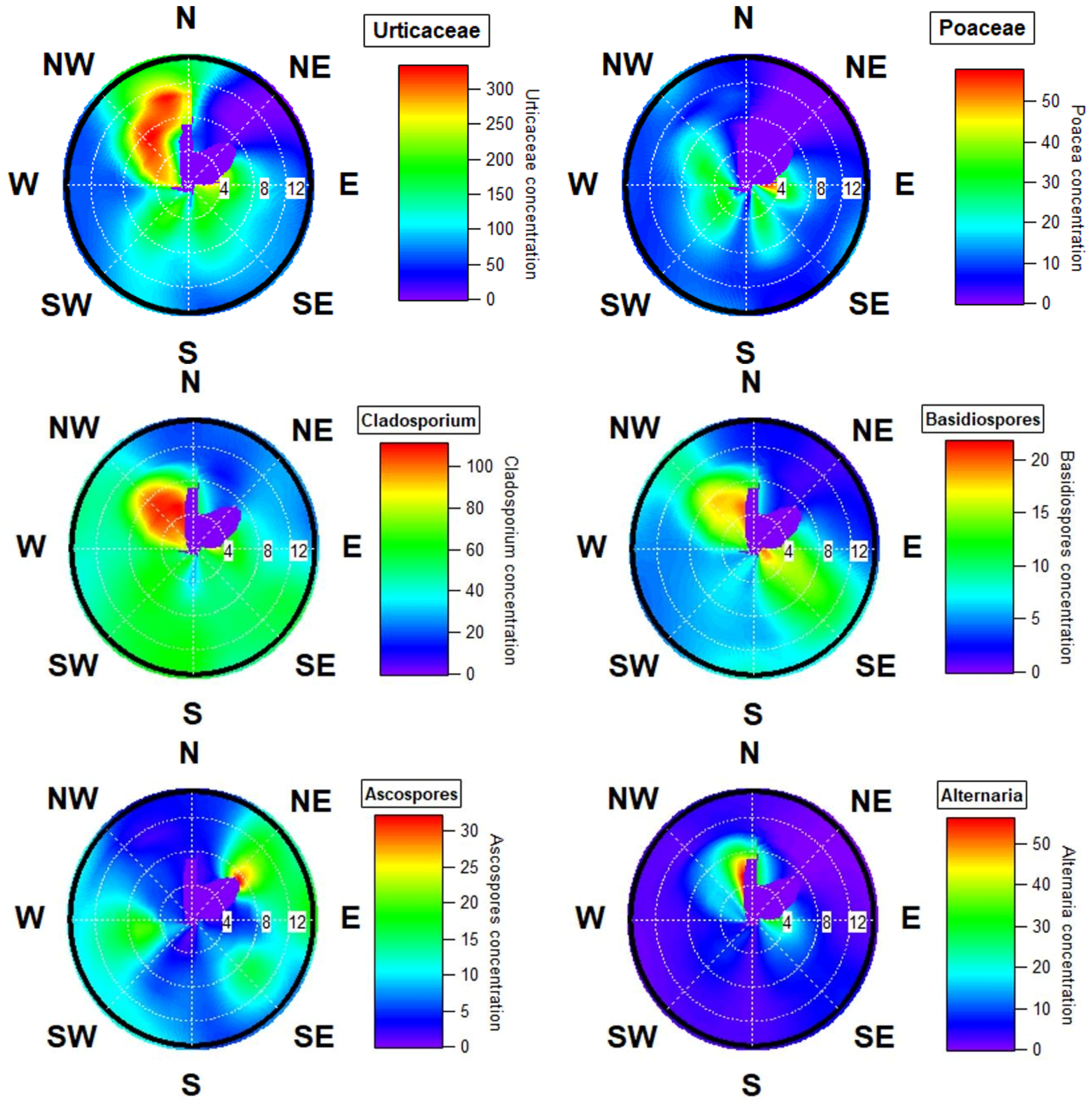 - Grinn-Gofroń, A.; Bosiacka, B.; Bednarz, A.; Wolski, T. A comparative study of hourly and daily relationships between selected meteorological parameters and airborne fungal spore composition. Aerobiologia 2018, 34, 45–54. [Google Scholar] [CrossRef] [PubMed]