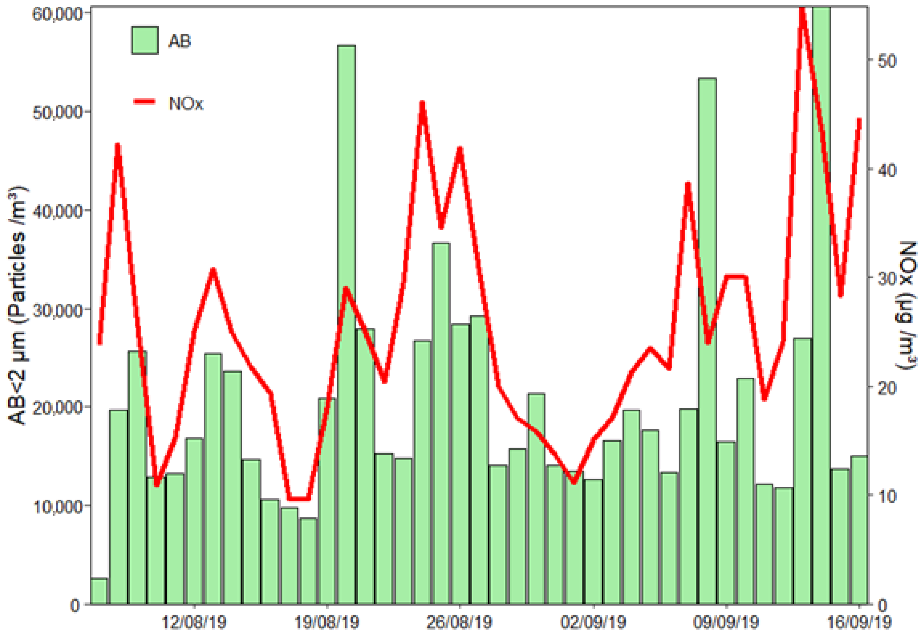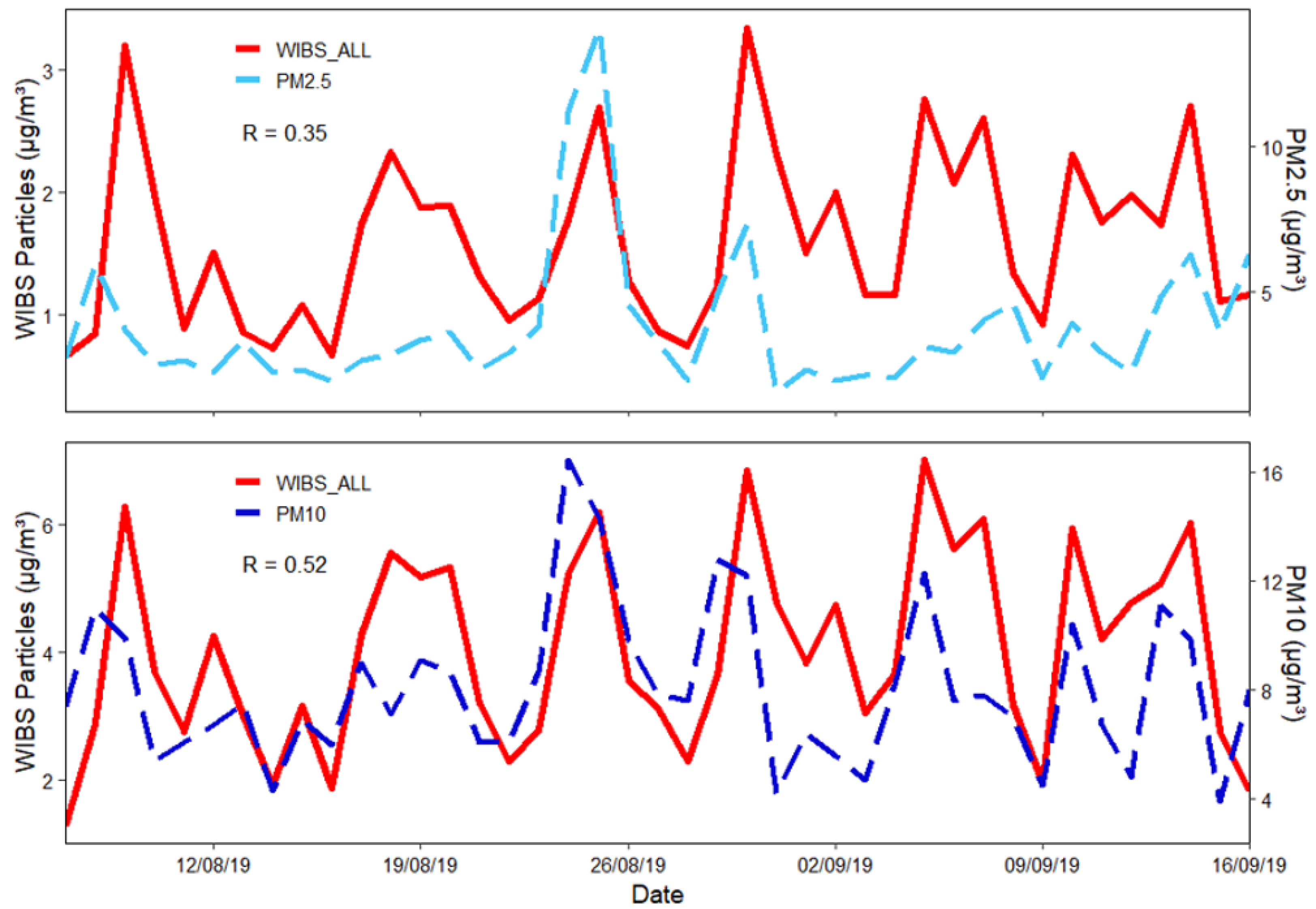 - Markey, E.; Hourihane Clancy, J.; Martínez-Bracero, M.; Sarda-Estève, R.; Baisnée, D.; McGillicuddy, E.J.; Sewell, G.; Skjøth, C.A.; O’Connor, D.J. Spectroscopic detection of bioaerosols with the wibs-4+: Anthropogenic and meteorological impacts. Sci. Total Environ. 2024, 943, 173649. [Google Scholar] [CrossRef]