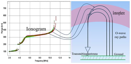 The Ionosonde transmits radio waves vertically upwards and receives the reflected signals at the same location. The reflection height can be obtained by measuring the time required for radio waves to propagate back and forth with frequency changes [21] (Scotto and Pezzopane, 2004). A schematic diagram of vertical sounding is shown in Figure 1, where the left side is the ionogram and the right side is the process of sounding by the Ionosonde. Since radio waves travel more slowly in the ionosphere than the speed of light, the reflected height obtained is not the true physical height of the ionosphere. This reflected height is called the virtual height. According to the theory of radio wave propagation, the virtual height is determined by the group refractive index of the ionosphere, which in turn is determined by the distribution of ionospheric electron density and the operating frequency. This relationship can be expressed as Equation (1):