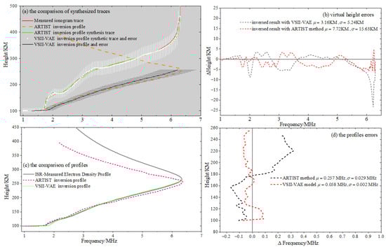 Figure 7b, Figure 8b and Figure 9b shows the distribution of differences between the synthesized virtual height from the profile and the measured ionogram virtual height at different frequency points. It can be seen that the overall synthesized virtual height error for the profile inverted by the VSII-VAE model is smaller than that of the ARTIST method, and all error values are kept within a range of 5 km. Figure 7c, Figure 8c and Figure 9c visually compares the consistency between the inversion profiles from the VSII-VAE model, the inversion profiles from the ARTIST method, and the ISR measurement profiles. Figure 7d, Figure 8d and Figure 9d analyzes the differences between the electron density inversion values obtained by two methods and the ISR measured values at different altitudes. The results indicate that the differences are smaller within the 100–120 km altitude range; in the 120–150 km range, the errors tend to increase because this region corresponds to the valley layer, where inversion is more challenging; in the 230–260 km range, the errors increase again, as this region corresponds to the peak height of the F layer, where drastic electron density variations lead to higher inversion errors.