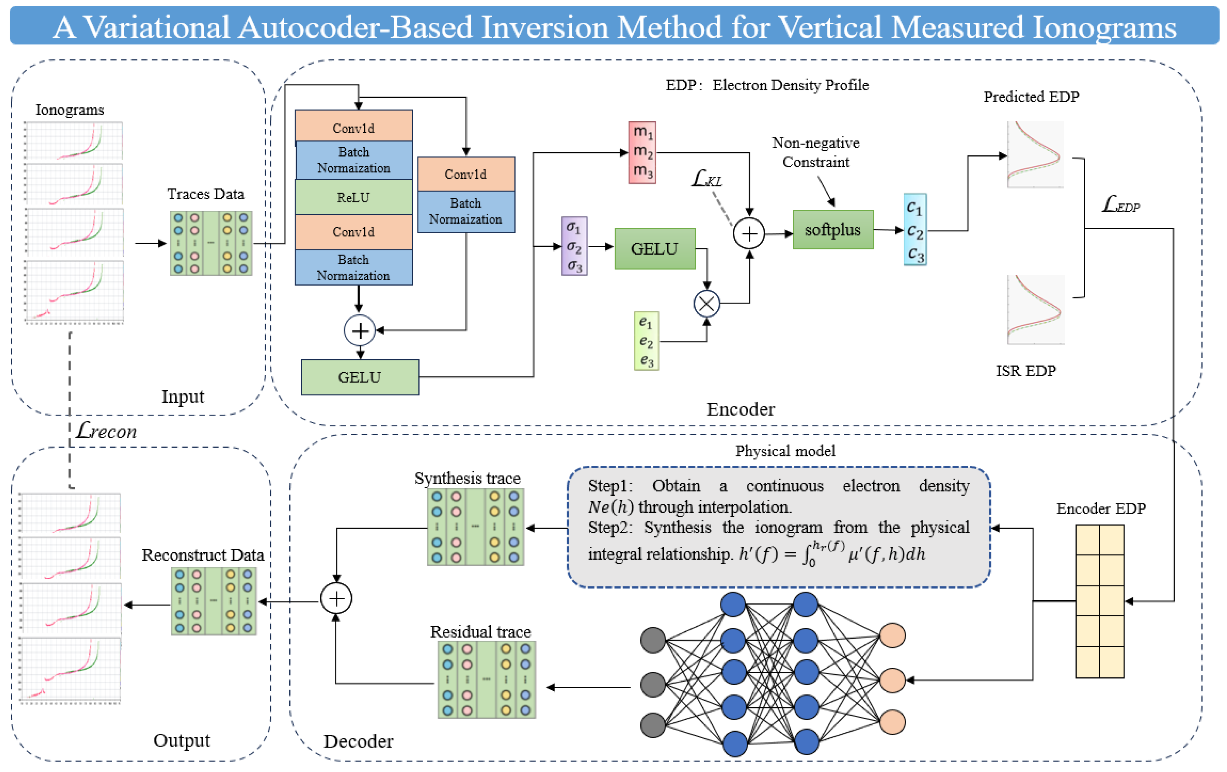 19]. Traditional inversion methods rely on explicit physical models and prior assumptions, which cannot fully capture all the information in the data, while VAE provides a data-driven approach that can automatically learn the latent representations of data from a large amount of observational data. Moreover, the structure of the VAE encoder and decoder shows significant consistency with the forward modeling and inversion processes of the ionogram. Therefore, we employ a VAE to perform inversion of ionograms, following this specific workflow: First, in the encoder section, the input ionogram trace data is mapped to a latent space to obtain the corresponding electron density distribution representation. During training in the hidden variable space, we incorporate electron density profiles from Incoherent Scatter Radar (ISR) observations as labeled data to ensure that the inversion results align with actual physical observations [