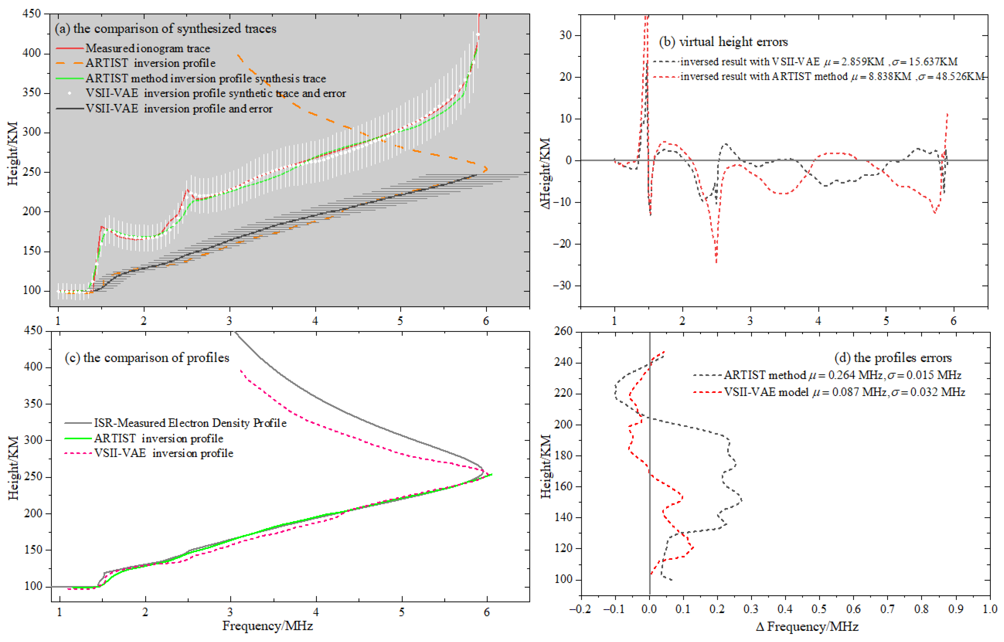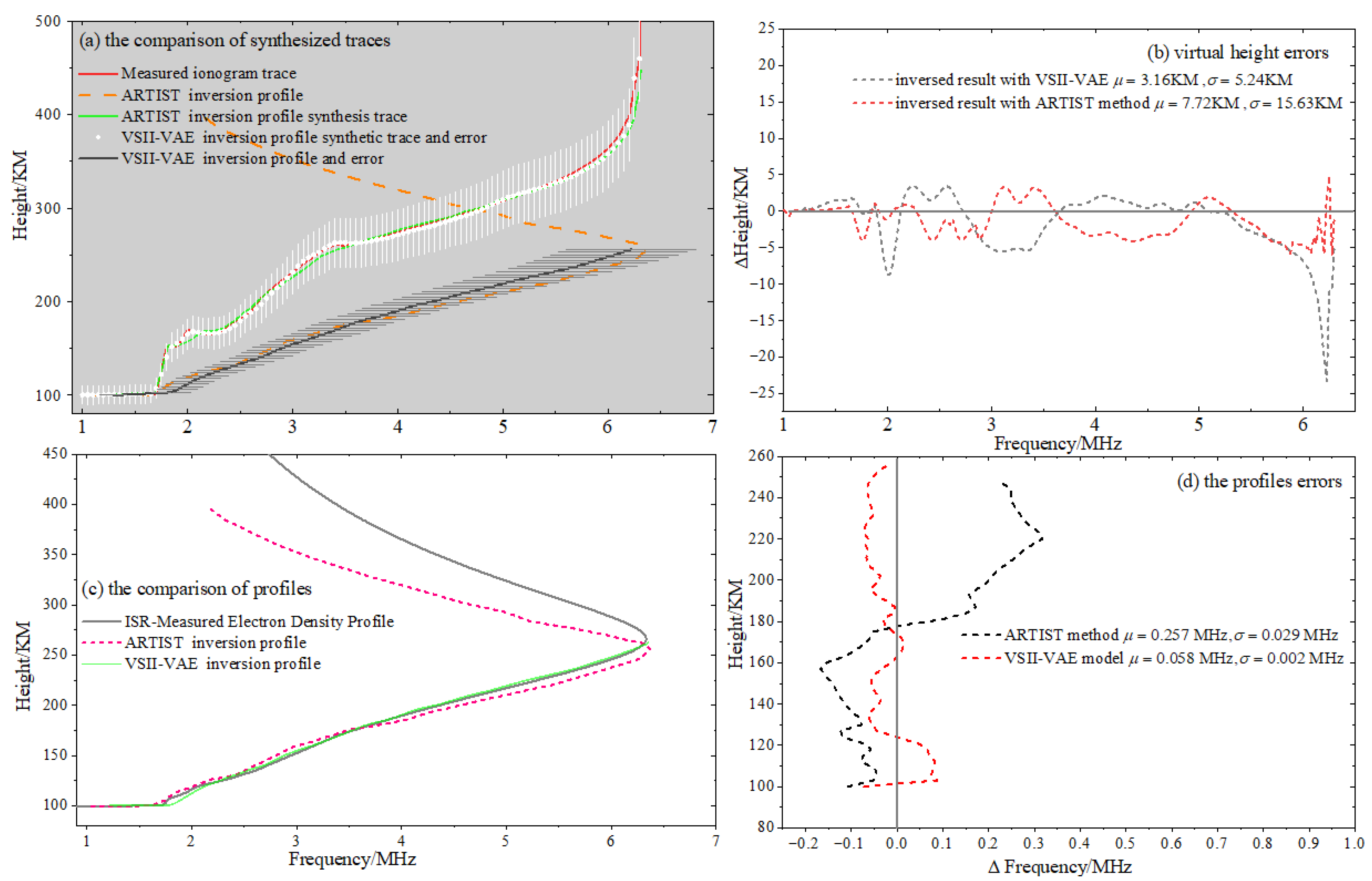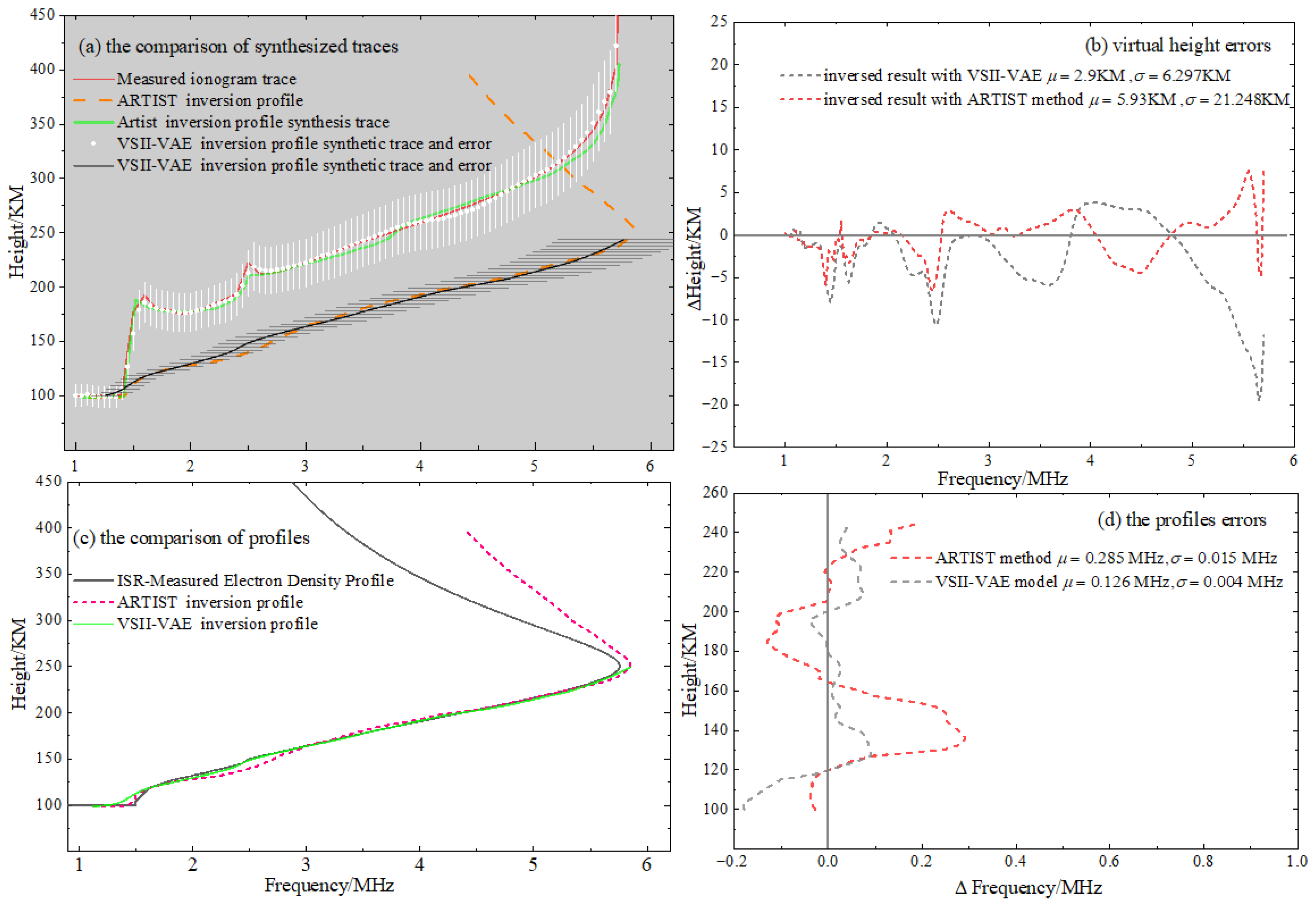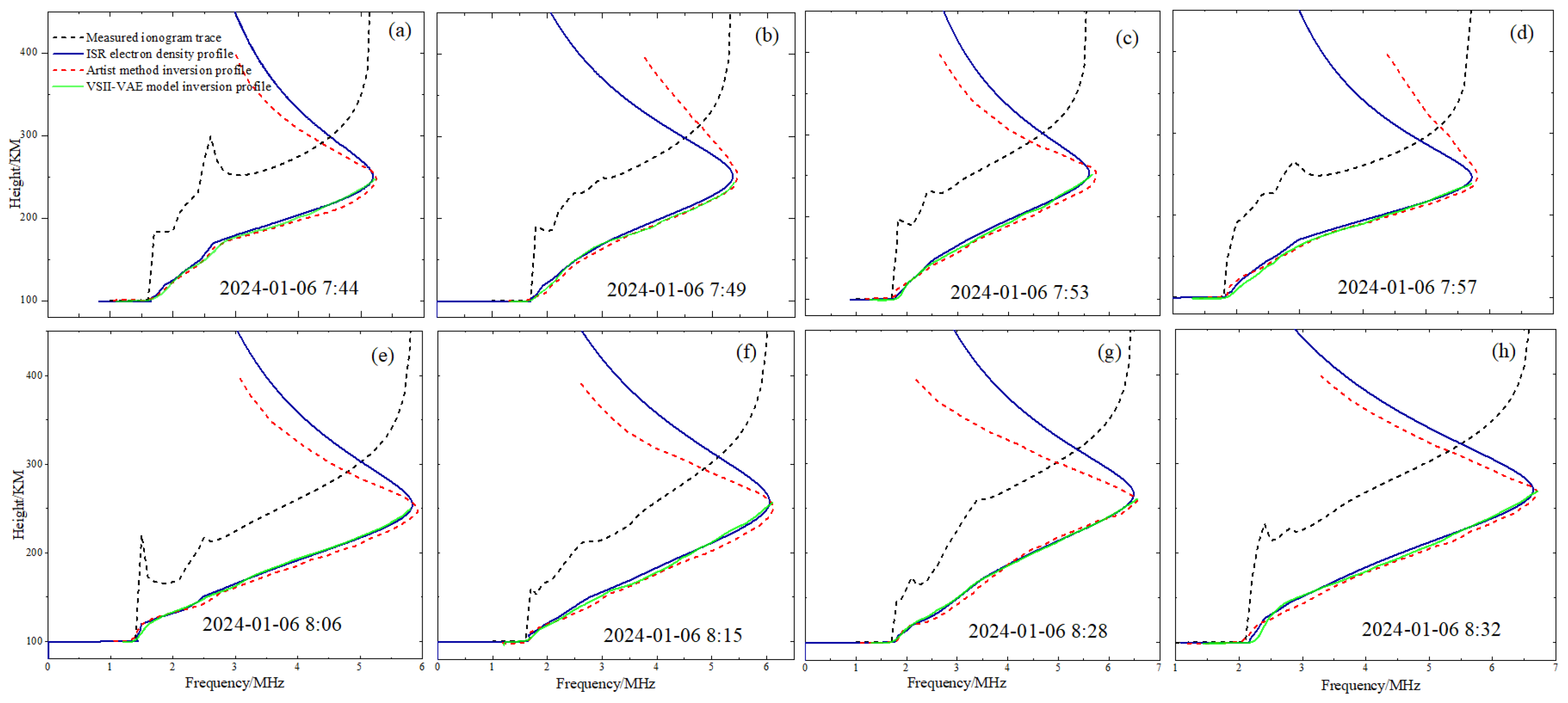 Figure 5, the black dashed line represents the measured ionogram trace, the red dashed line represents the electron density profile inverted using the ARTIST method, the green solid line represents the profile inverted by the VSII-VAE model, and the blue solid line represents the ISR measured profile. By comparison, the inversion profile of the VSII-VAE model is highly consistent with the trend of the ISR measured profile. The overall fitting performance is good, fully demonstrating the effectiveness of the model’s inversion result.