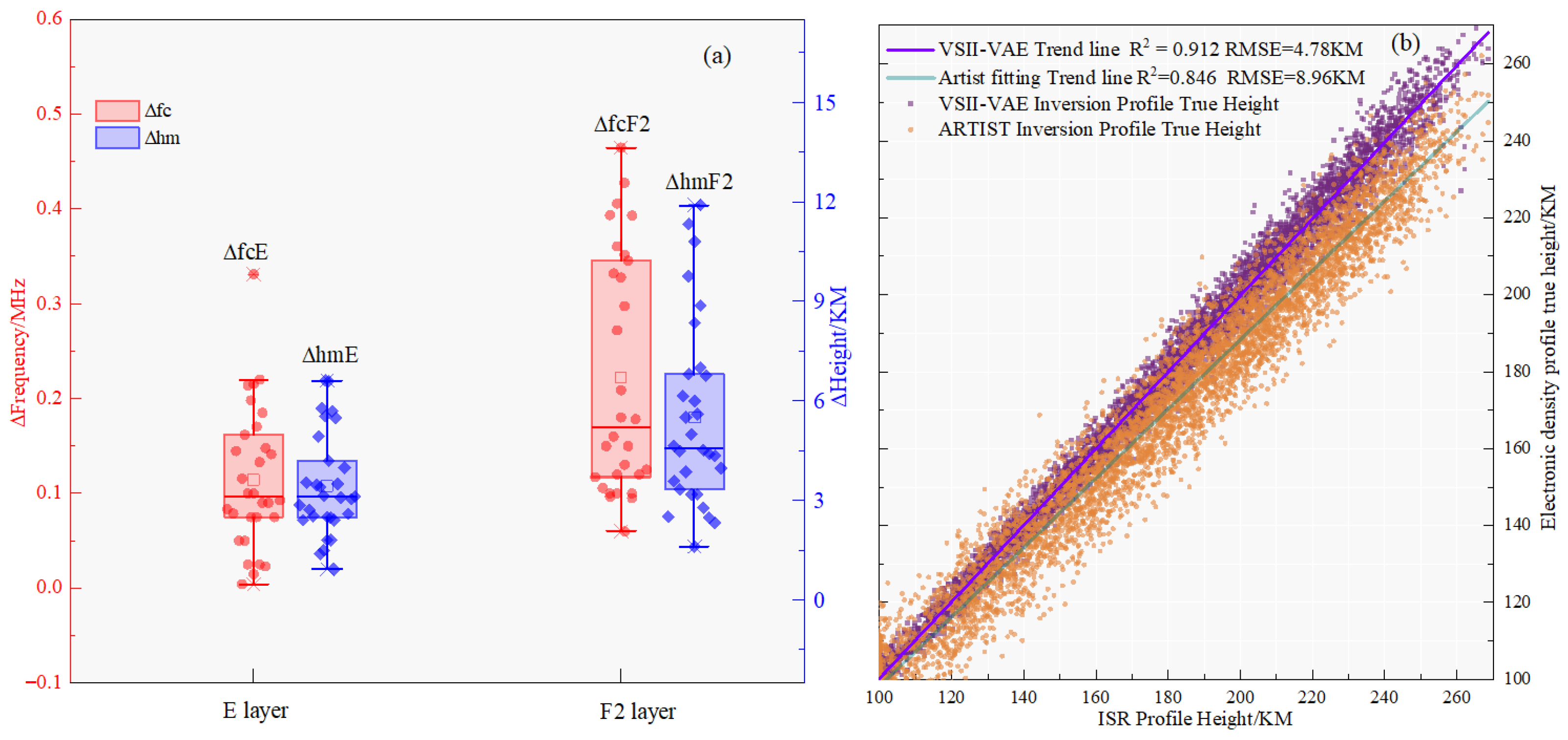 Figure 6b further compares the consistency between the true heights corresponding to different frequencies and the ISR measured true height after inversion of 30 sets of ionograms using the VSII-VAE model and the ARTIST method, and reports the R