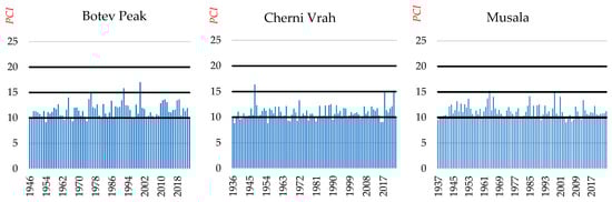 The calculated annual values of the Precipitation Concentration Index (PCI) reveal the pattern of intra-annual precipitation distribution. Figure 3 illustrates pronounced interannual variability, with some years exceeding the thresholds between the different classes defined in Table 2. In years when PCI values are below 10, precipitation is relatively evenly distributed throughout the months, indicating a lower risk of pronounced dry or wet seasons. However, the majority of the analyzed years exhibit PCI values between 10 and 15, i.e., within the class of “Weakly uneven” distribution. This indicates a moderate concentration of precipitation, typical of the climatic conditions in the study area, where a distinct precipitation maximum is observed in late spring and early summer. Higher PCI values (15 < PCI ≤ 20), recorded in certain years, reflect strongly expressed seasonality, in which most of the annual precipitation amount is concentrated in a limited number of months. Such values correspond to the “Uneven” distribution class, highlighting the vulnerability of the region to extreme events—intense precipitation over short periods and prolonged dry intervals. The graphical representation of the results (Figure 3) shows no evident trend during the analyzed period. Instead, alternating years with relatively even precipitation distribution and years with pronounced concentration are observed, which is likely driven by the influence of atmospheric circulation and regional climatic factors on the formation of the annual precipitation regime. The absence of PCI values above 15 at Musala reflects a more uniform precipitation regime, likely driven by its extreme elevation (2925 m) and synoptic-scale precipitation [47].