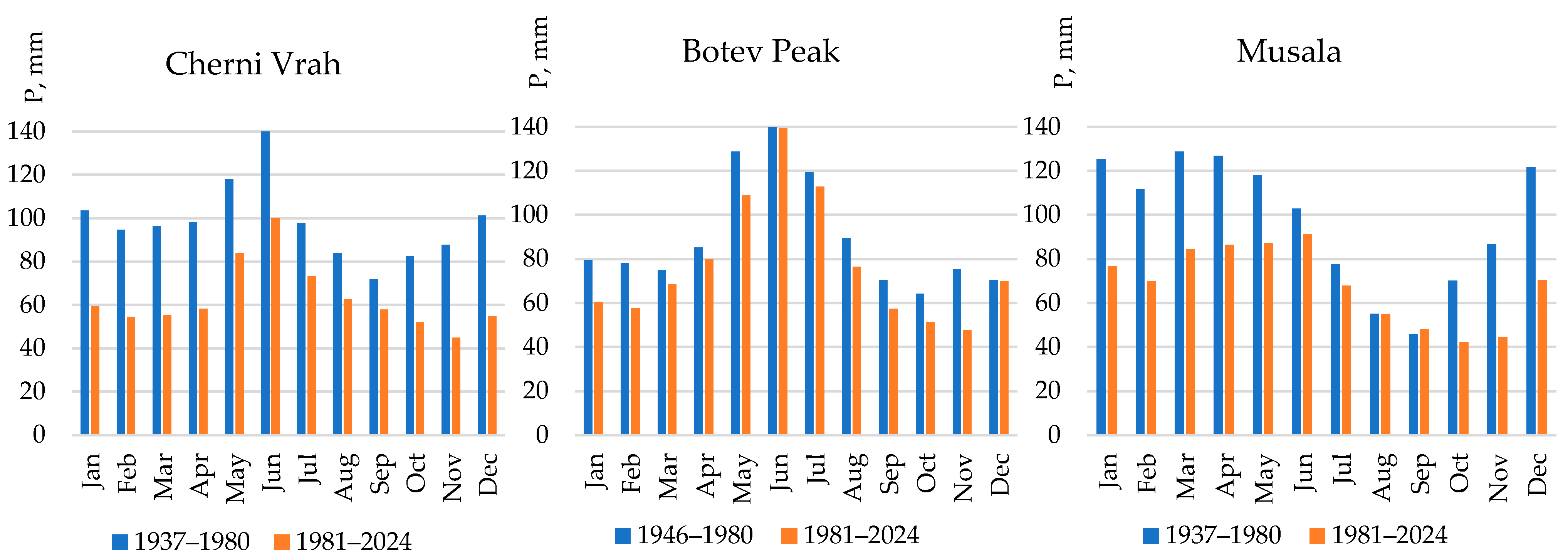 The precipitation regime in the studied areas is generally characterized by a maximum in May–June, although at Musala it occurs earlier (April–May). A secondary peak is observed in December–January. Monthly precipitation amounts are lower in the 1981–2024 period compared to the 1937 (1946)–1980 period (