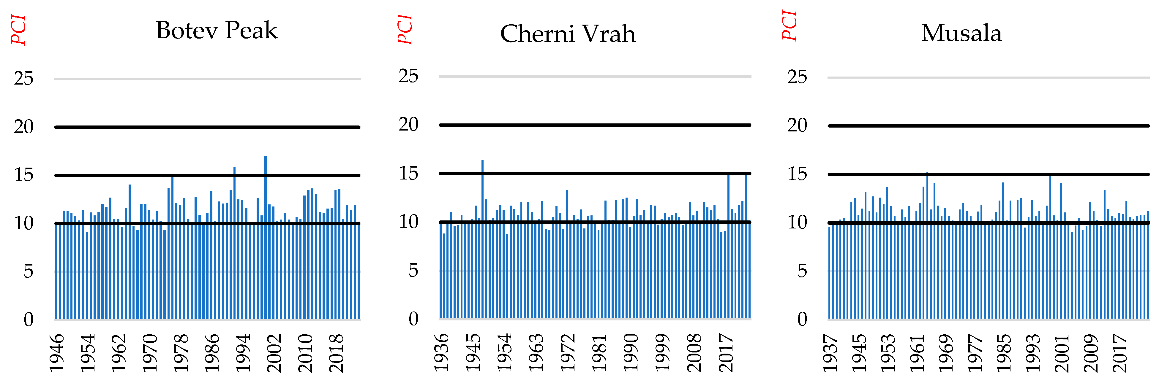 PCI values above 15 at Musala reflects a more uniform precipitation regime, likely driven by its extreme elevation (2925 m) and synoptic-scale precipitation [