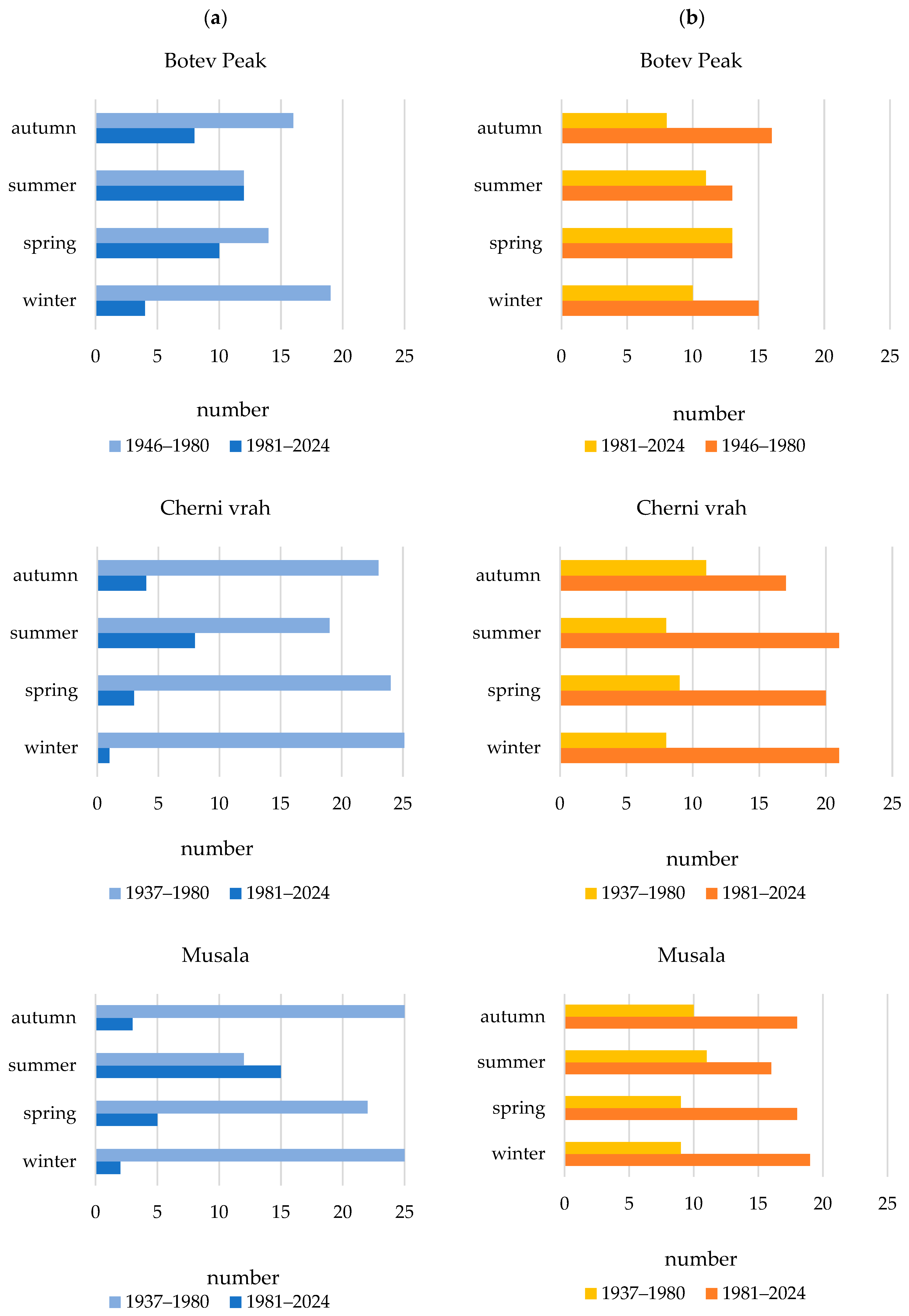 Figure 4a). At Botev Peak, the total number of extreme wet months decreased sharply between the periods 1946–1980 and 1981–2024, with winter extremes falling from 19 to 4 months and autumn from 16 to 8, while spring showed a moderate reduction (14 to 10) and summer remained stable (12 months in both periods). Musala exhibited a similar pattern: cold-season wet extremes virtually disappeared in winter (from 25 to 2) and autumn (from 25 to 3), whereas in summer, wet extreme precipitation months increased from 12 to 15 months.