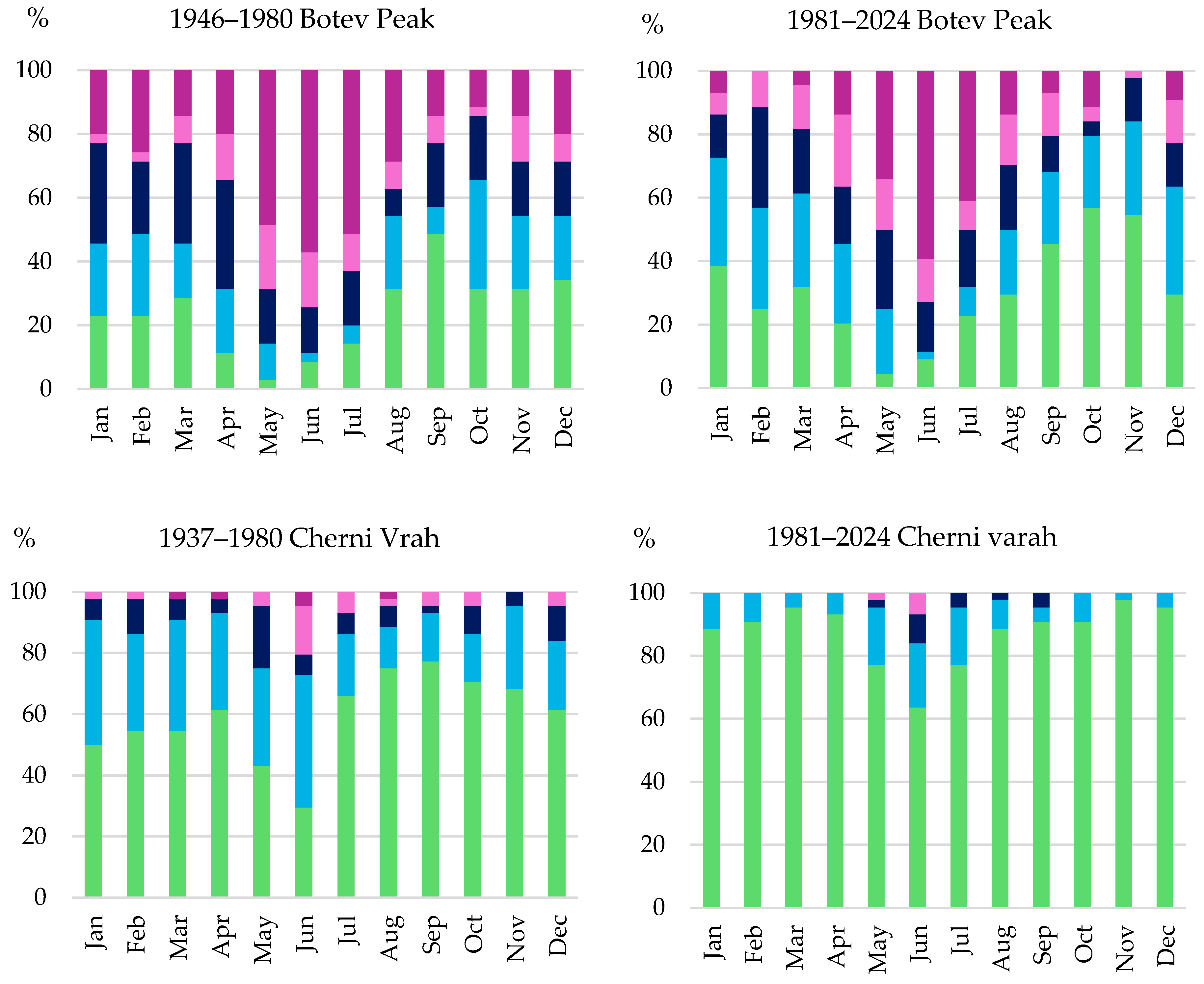 Figure 4b). At Botev Peak, the number of winter dry months increased from 10 in 1946–1980 to 15 in 1981–2024, while autumn dry months rose from 8 to 16. Spring remained stable at 13, and summer increased slightly from 11 to 13. These changes indicate that dry conditions intensified primarily during the cold season, with relatively minor changes in the warmer months. At Cherni Vrah, the increase in dry months is even more pronounced. Winter dry months more than doubled, rising from 8 to 21, spring increased from 9 to 20, summer from 8 to 21, and autumn from 11 to 17.
