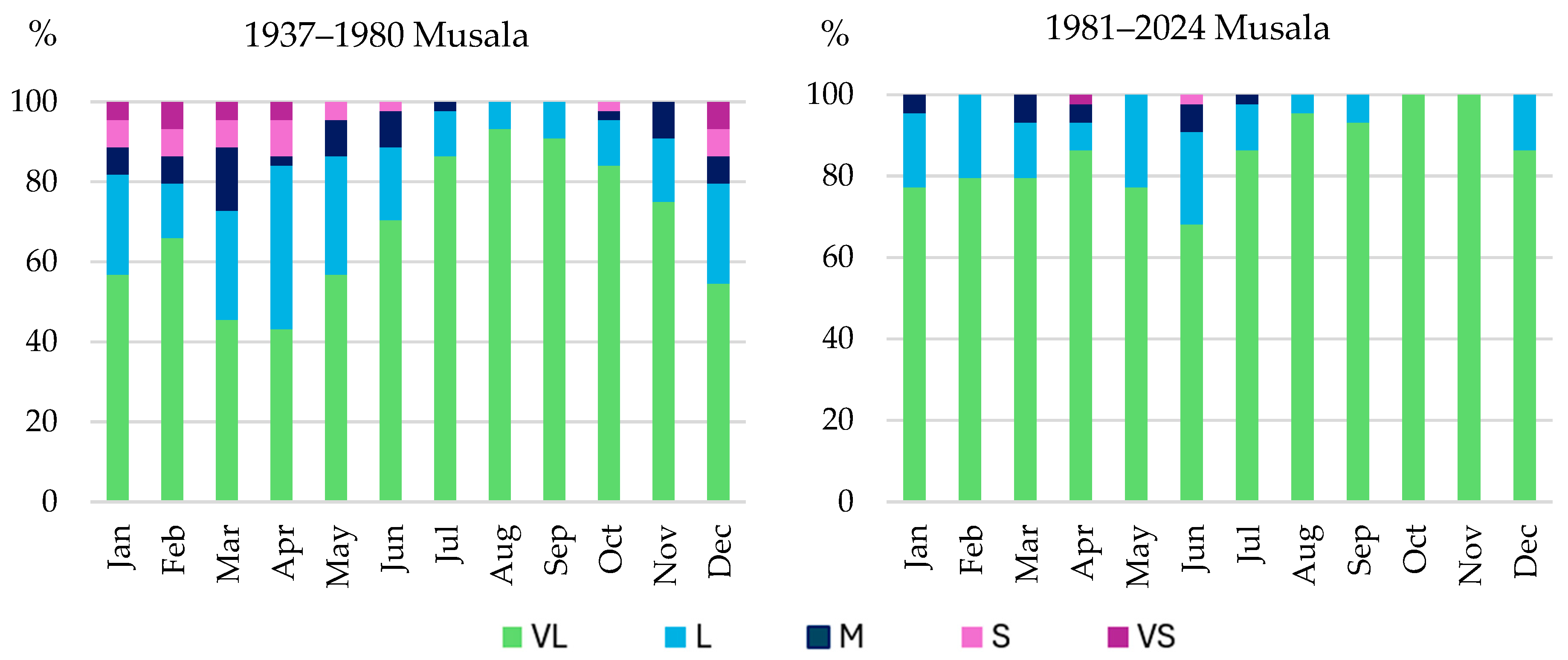58]. After 1980, however, both stations became dominated by the months with very low precipitation erosivity class (
