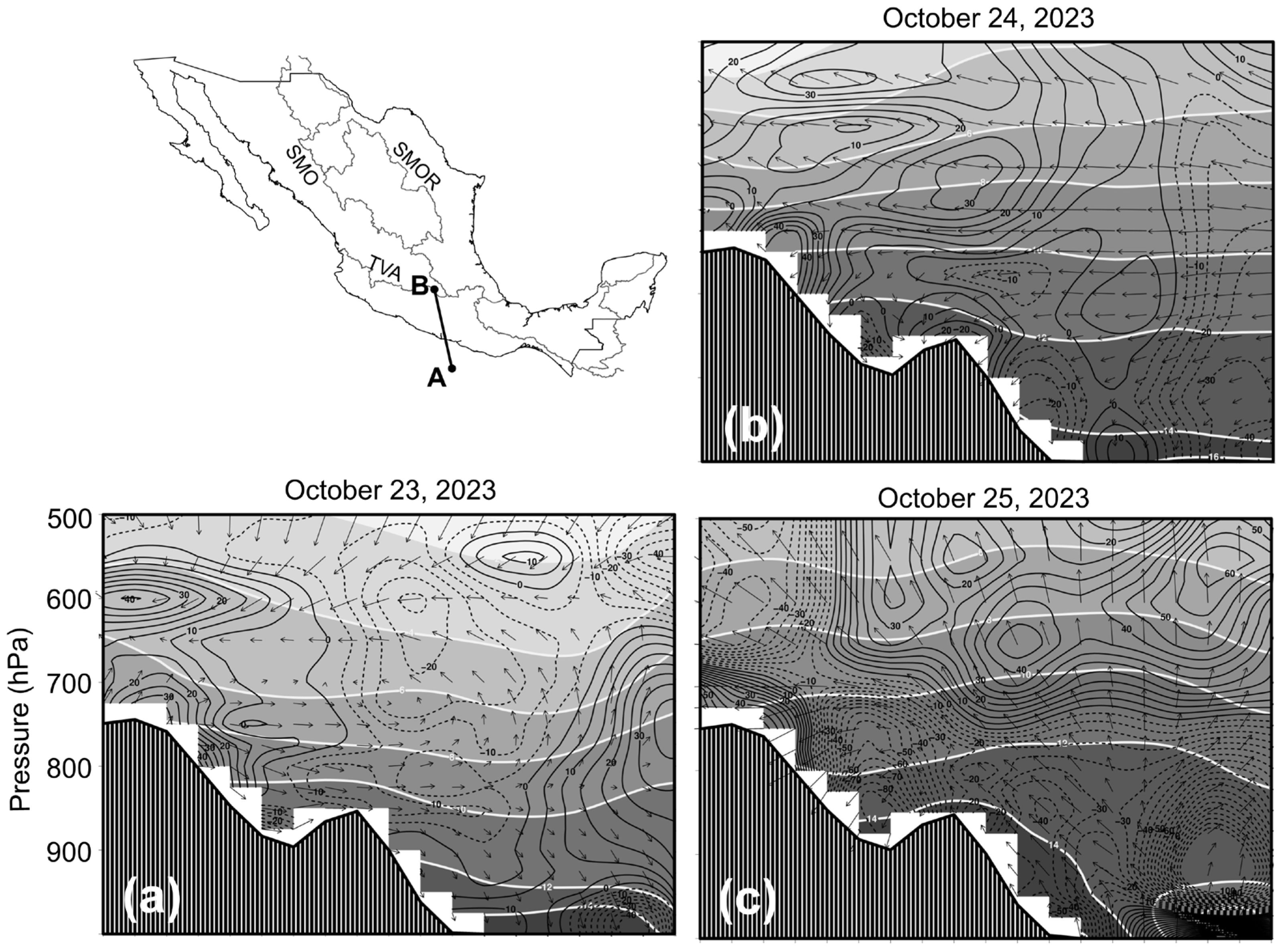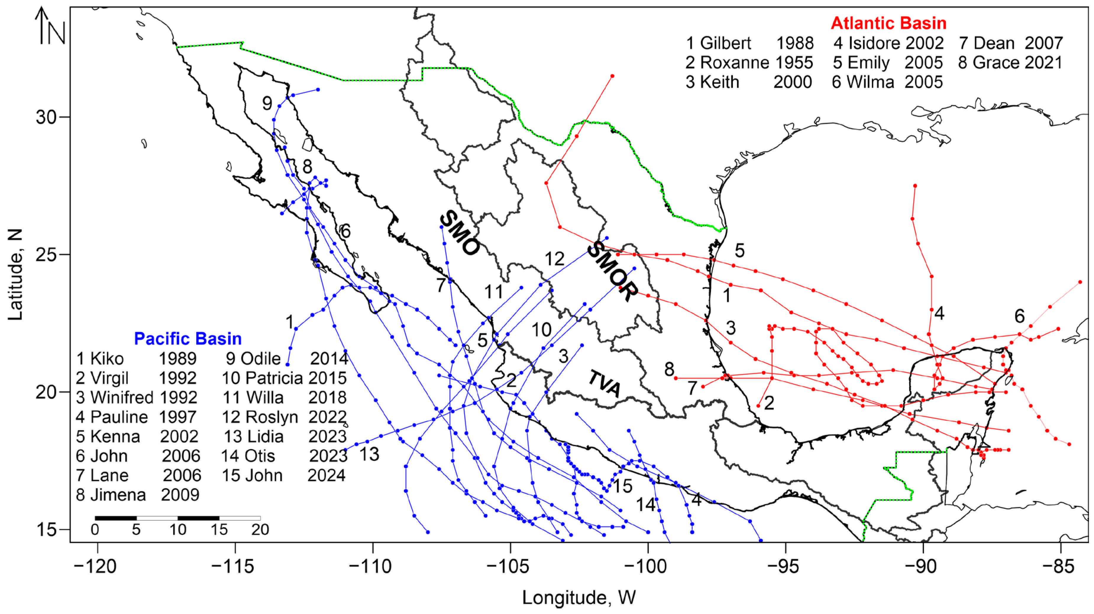 - Brito-Castillo, L.; Farfán Molina, L.M.; Vega Camarena, J.P.; Cortés Ramos, J.; León Cruz, J.F. Condiciones meteorológicas asociadas con el huracán John (2024) comparadas con las de otros ciclones tropicales (1989–2023) en Guerrero. In Monitoreo de Peligros Hidrogeológicos y Sus Efectos en el Sur de México Tras el Paso del Huracán John; Pérez Gutiérrez, R., Frausto Martínez, O., Pardo Pedrote, I.A., Carreto Gutiérrez, J.A., Eds.; Universidad Autónoma de Guerrero: Chilpancingo, Mexico, 2025. [Google Scholar]
