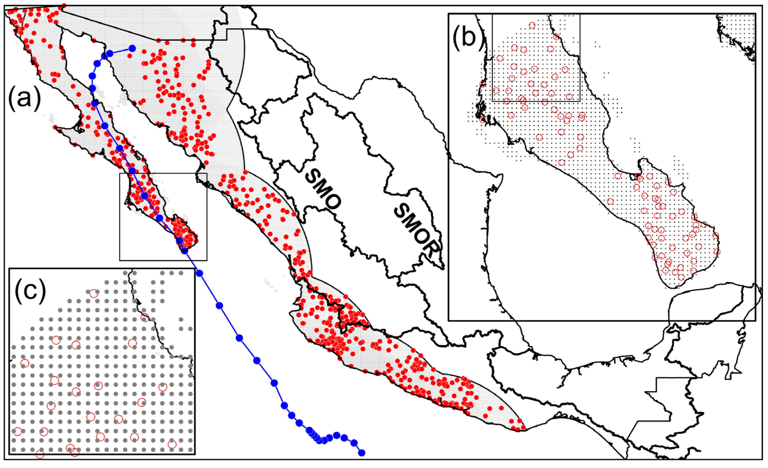 - Englehart, P.J.; Douglas, A.V. The role of eastern North Pacific tropical storms in the rainfall climatology of western Mexico. Int. J. Climatol. 2001, 21, 1357–1370. [Google Scholar] [CrossRef]