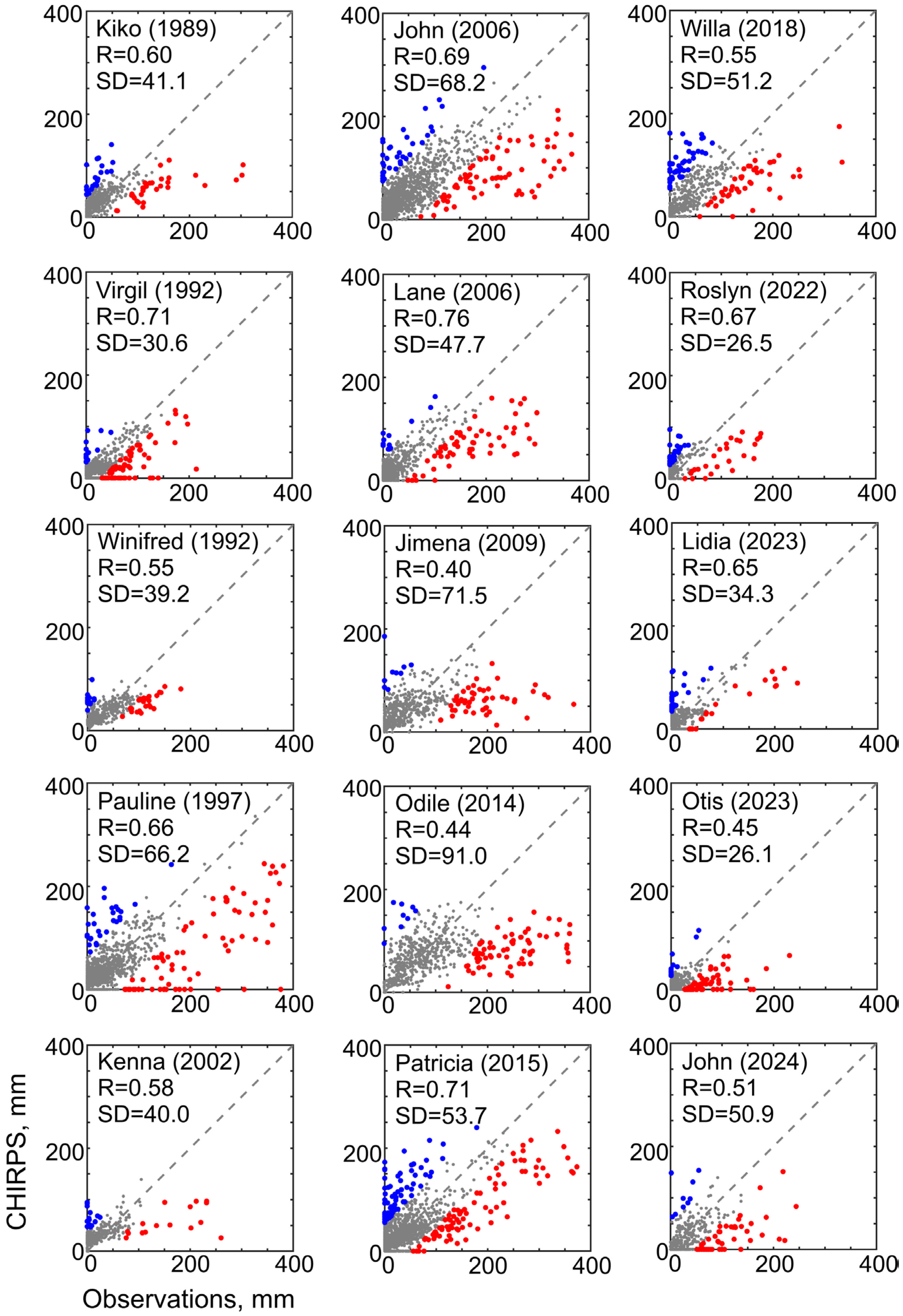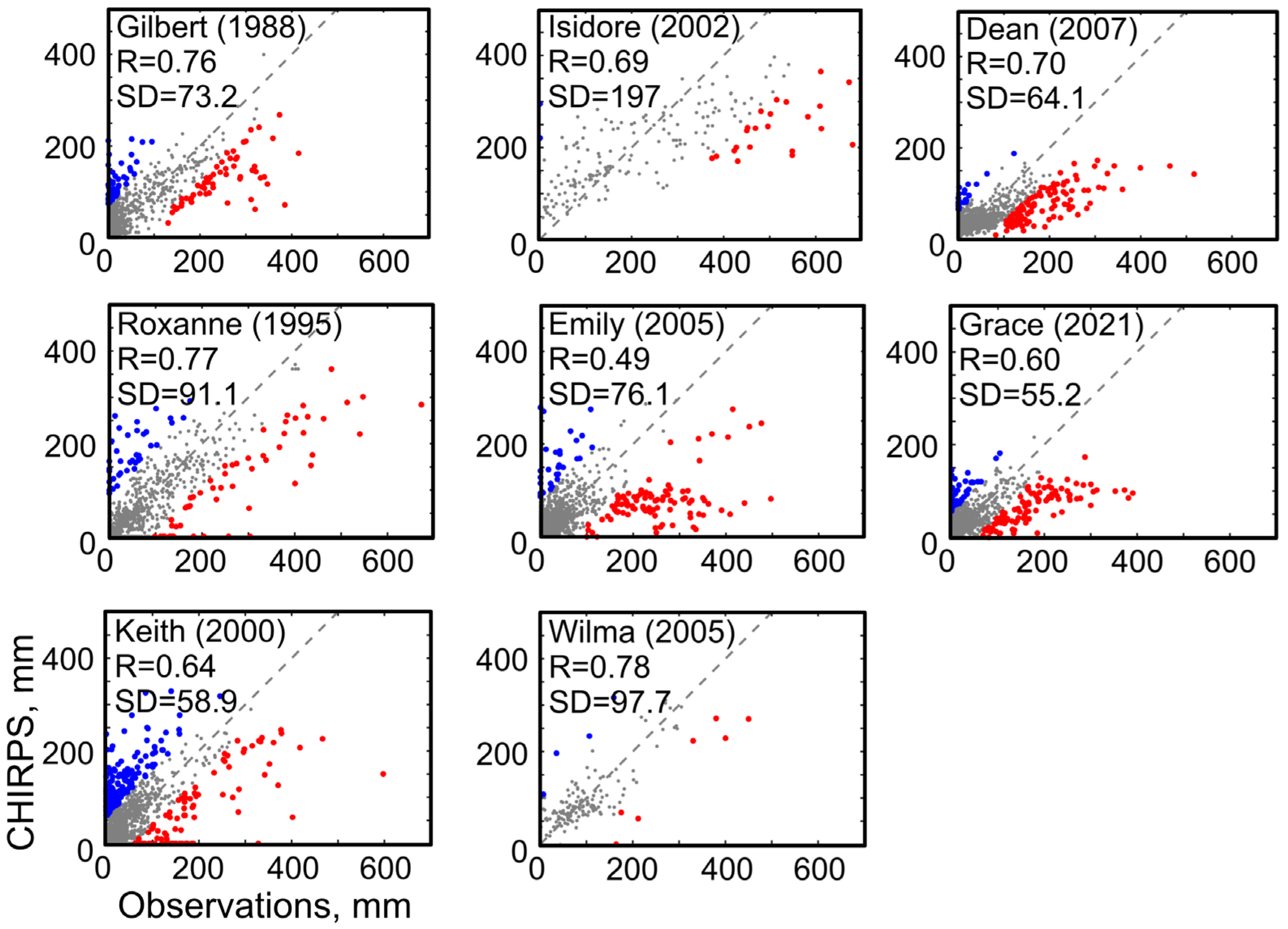 - In the initial stages of TC, CHIRPS is unable to reproduce the accumulations of precipitation, resulting in low correlations between the observations and database estimates.