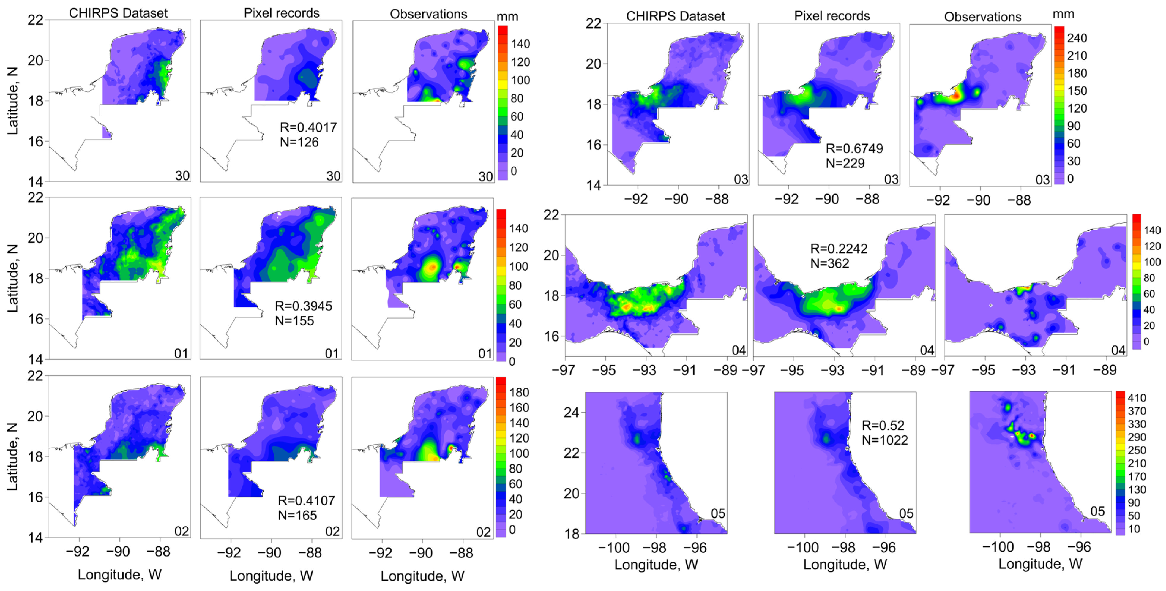 - Based on the average correlation between observed and estimated cumulative precipitation and precipitation for specific dates, the Atlantic basin shows a higher correlation (R = 0.68 and R = 0.30, respectively) than the Pacific basin (R = 0.56 and R = 0.23), indicating that in general, CHIRPS better replicates the precipitation distribution pattern in the Atlantic.