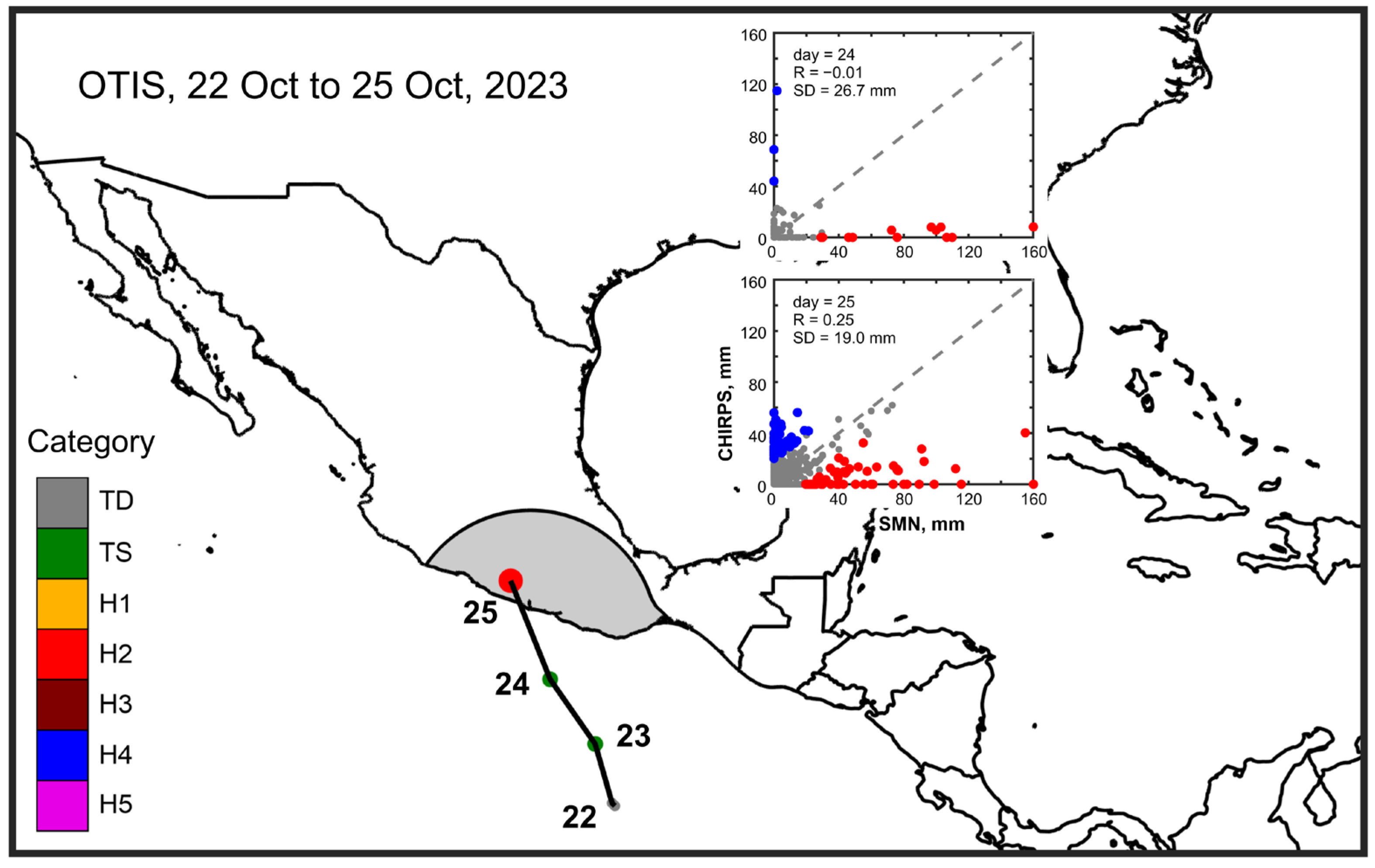- Reinhart, B.; Reinhart, A. Tropical Cyclone Report: Hurricane Otis (EP182023), 22–25 October 2023; NOAA/NWS/NHC Tech. Rep.: Miami, FL, USA, 2024; p. 39. Available online: https://www.nhc.noaa.gov/data/tcr/EP182023_Otis.pdf (accessed on 12 June 2025).