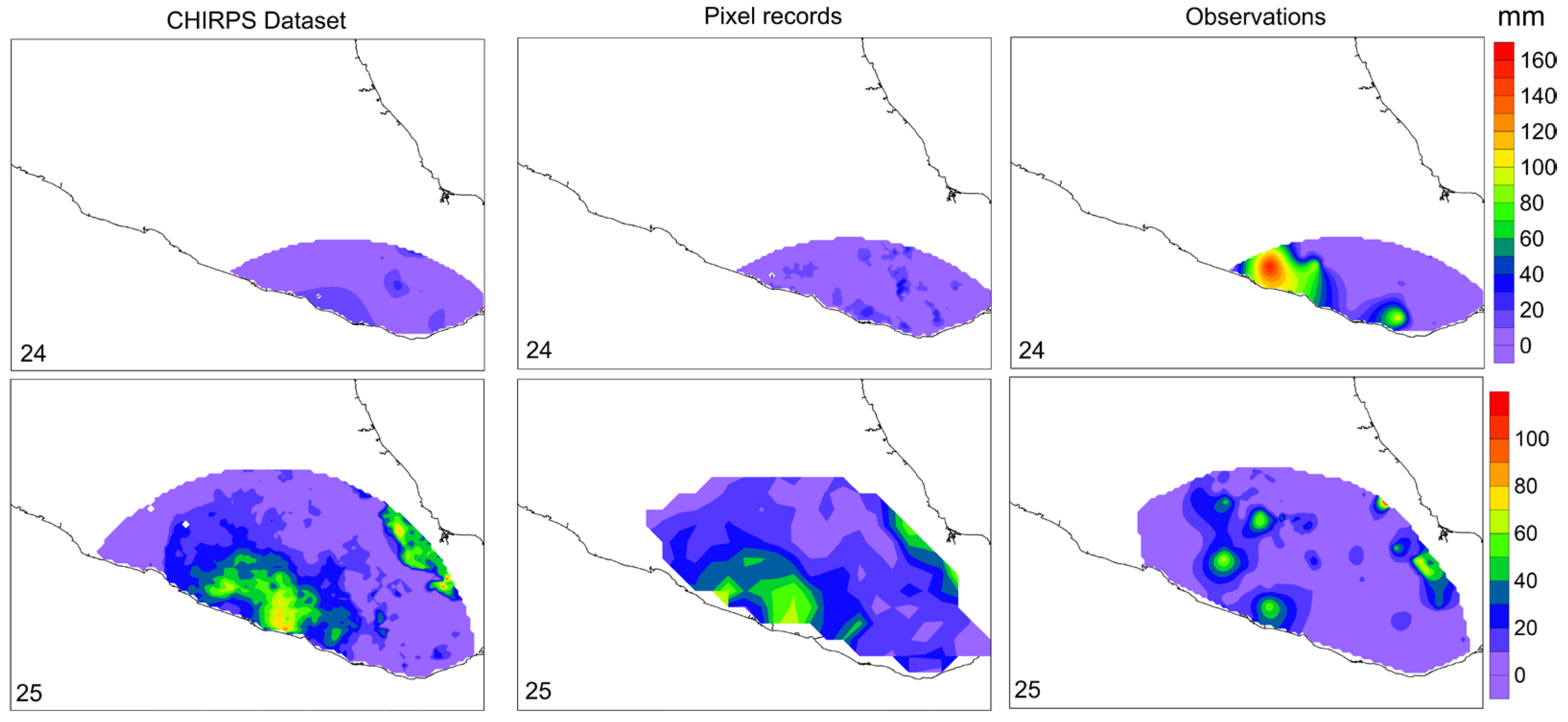 - The correlations for specific dates between observations and estimates, in some cases, were statistically significant (i.e., in the range 0.40–0.76 for the Pacific and 0.49–78 for the Atlantic). However, this result does not guarantee congruence between observations and estimates since, as discussed, CHIRPS fails to adequately reproduce the position of the highest precipitation core, to overestimate small precipitation, and to underestimate large precipitation.