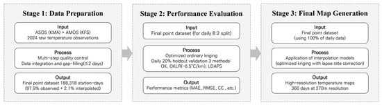We employed a three-stage approach to generate high-resolution daily temperature maps for South Korea for the entire year of 2024 (1 January–31 December; 366 days) (Figure 3). First, we processed and quality-controlled temperature observations from two complementary networks: ASOS (90 stations) and AMOS (up to 474 stations). Multi-step quality control (QC) procedures and gap-filling (≤2 days) yielded a final point dataset of 188,318 station–days (Section 3.2).