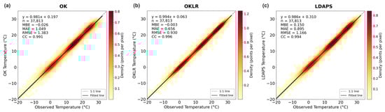 Density scatterplots comparing modeled vs. observed temperatures for three interpolation approaches: (a) OK, (b) OKLR, and (c) LDAPS. The 1:1 line (gray dashed) and linear regression fit (black solid) are shown. Inset text provides key performance metrics: sample size (n), MBE, MAE, RMSE, and correlation coefficient (CC).
