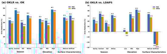 Relative error reduction achieved by OKLR compared to (a) OK and (b) LDAPS across seasons, elevation classes (low: <300 m, mid: 300–700 m, high: >700 m), and surface characteristics (natural vs. artificial). Blue and orange bars represent MAE and RMSE reductions, respectively.