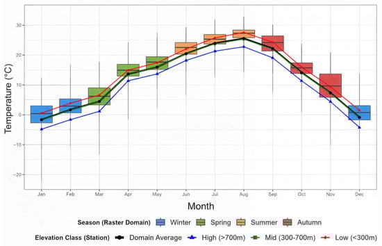 where LR is the standard atmospheric lapse rate of −6.5 °C/km [31], a widely used constant representing average tropospheric conditions. To ensure consistency between downward adjustments and upward corrections, we used elevations extracted from the same SRTM DEM used to produce the final grid, rather than the official station elevations. Second, these sea-level-adjusted temperatures were spatially interpolated to a 270 m grid using ordinary kriging. Third, the interpolated grid was readjusted to actual surface elevations using the SRTM DEM: