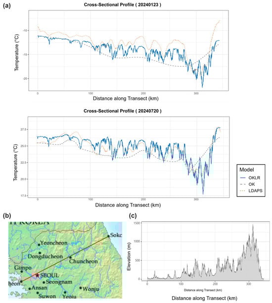 In conclusion, this study provides a nationwide, annual, high-resolution daily temperature dataset for South Korea’s complex terrain and quantitatively demonstrates the substantial value of lapse rate correction. By transparently characterizing the model’s capabilities and limitations, this research enables practitioners to assess the dataset’s suitability for specific applications. Notably, the analysis reveals that OKLR and LDAPS exhibit complementary strengths: LDAPS excels in resolving surface-atmosphere interactions in lowlands, whereas OKLR offers superior fidelity in mountainous regions owing to its direct observational grounding. These findings provide practical guidance for generating high-resolution temperature fields essential for climate change adaptation, precision agriculture, and ecosystem monitoring in topographically diverse environments.