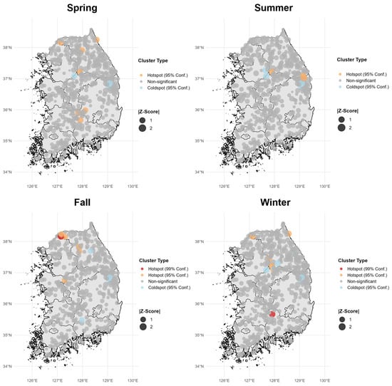 For this analysis, 2024 daily mean air temperature data were obtained via public Application Programming Interfaces (APIs) from 90 ASOS stations (KMA) and 474 AMOS stations (KFS) within the study area. These data were accessed on 12 January 2025 and 5 January 2025, respectively. Temperature sensors are installed at 1.5 m (ASOS) and 2.0 m (AMOS) above ground level. The potential impact of this 0.5 m height difference on daily mean temperatures and inter-network consistency is further examined in Appendix A.
