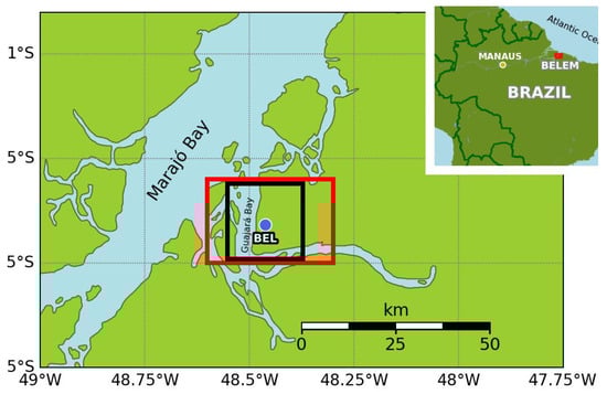 The region of the study. It includes the 20 km by 20 km area of lightning detection (black box) and the 33 km by 22 km GPM data coverage area (red box) and the approximate location of the Belém (blue dot labeled “BEL”) GNSS/INMET/Radiosonde meteorological stations. We refer to these areas as the “Belém box”.