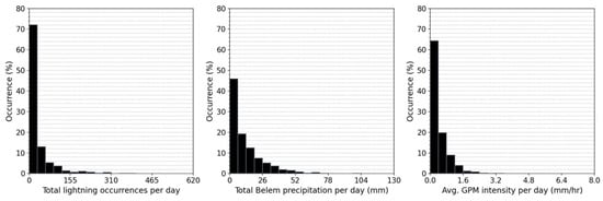 A histogram of the distribution of percentage of days with convective events based on total lightning occurrences per day (left), total precipitation per day at Belém station (center), and total precipitation per day with GPM data (right).