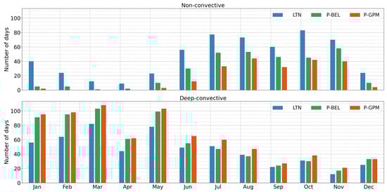 Beginning with Figure 3, the histogram distribution is displayed for each convective day category for both lightning- (denoted as LTN) and precipitation-based data (P-GPM and P-BEL for GPM and Belém local station data, respectively), as well as the total number of deep-convective and non-convective days from 2014 to 2019. In general, for the precipitation data, deep-convective days greatly outnumbered non-convective days, which is not unexpected, as Belém is an entry point to the Amazon Basin. Additionally, there is a small difference of less than 6% between the P-GPM and P-BEL events, which can be explained by the fact that P-BEL is a point measure that could miss precipitation occurring in areas inside the Belém box away from the meteorological station. On the contrary, there was a larger number of non-convective days than deep-convective cases for LTN, indicating that lightning is a less common phenomenon during deep-convective events, with only 31.8% of total deep-convective days (based on precipitation data) experiencing it. The general distribution pattern based on intensity categories shown in Figure 3 for both lightning- and precipitation-based categories is quite similar in the percentages of events.