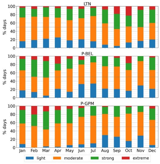 Continuing on with the analysis of monthly patterns in relation to the deep-convective intensity, some interesting results emerge (Figure 5). The results for precipitation-based days are as expected: moderate events dominate throughout the year, oscillating between 35% and 70% (see Figure 6), the percentage of light events increases during the dry season, and extreme and strong events tend to be the highest during the wet season. These results are in line with the decrease in water vapor content in the atmosphere during the dry season. As for lightning-based days, moderate and light days decrease in percentage during the dry season, while strong and extreme events increase, indicating that the deep-convective events with a high quantity of lightning tend to occur more during the dry season. These graphs alone do not reveal why this occurs, but the next set of results provides a clearer explanation for Figure 6.