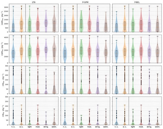 Violin plots superimposed on box-and-whisker plots for the instability indices CAPE and CIN (both pseudo-adiabatic (PA) and reversible (REV)) per category of convection intensity, for LTN, P-GPM, and P-BEL. Dots indicate outliers of the box-and-whisker plot; the solid black lines separate the plots for non-convective events and deep-convective events from the plots of the various deep-convective intensities.