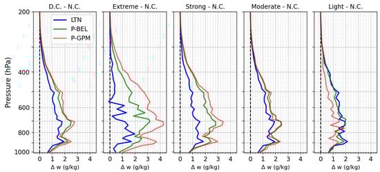 Vertical profile of the mixing ratio (w), given as the difference between all of the convective intensity categories, including all deep-convective cases (D.C.) and the vertical profile for the non-convective cases (N.C.). The dashed lines indicate 0 g/kg difference.