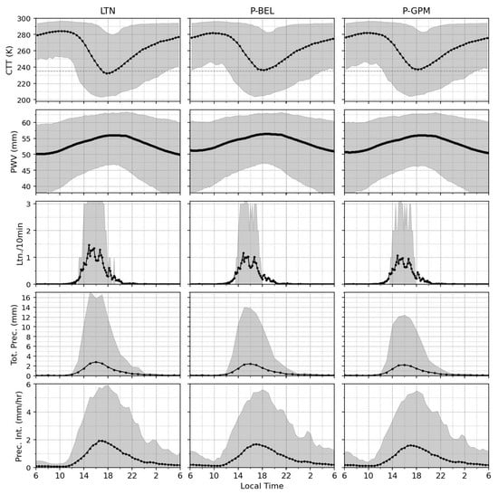The average diurnal cycle of CTT every 30 min, PWV every 5 min, lightning per 10 min, total hourly precipitation, and precipitation intensity every 30 min, with the shaded area signaling the cases between the 0.05 and 0.95 quantile for deep-convective events. The maximum shaded area for ltn./10 min was 8 ltn./10 min. The black dots on the black lines are representative of the temporal resolution of each data set. The dashed gray lines in top graphs mark the CTT threshold value of 235 K (CTT values less than 235 K signal deep convective clouds).