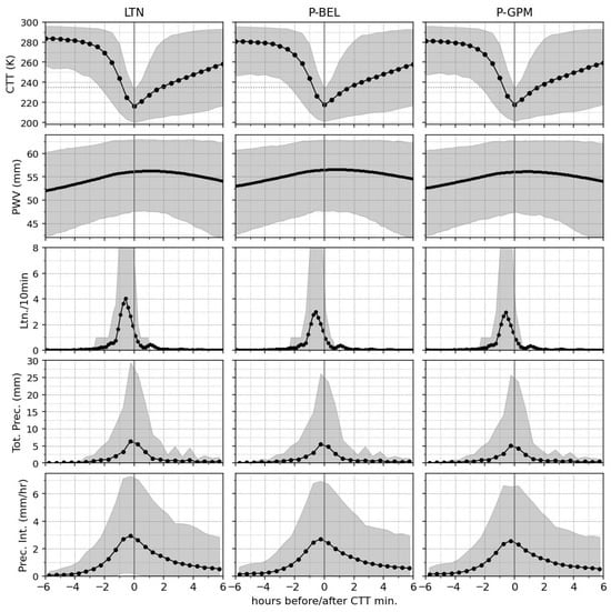 The average values 6 h before and 6 h after the CTT min of CTT every 30 min, PWV every 5 min, lightning per 10 min, total hourly precipitation, and precipitation intensity every 30 min, with the shaded area signaling the cases between the 0.05 and 0.95 quantile for deep-convective events. The ltn/10 min maximum for LTN reached 23 ltn/10 min. The black dots on the black lines are representative of the temporal resolution of each data set. The solid gray lines represent the start of the event; the dashed gray lines in the top graphs mark the CTT threshold value of 235 K (CTT values less than 235 K signal deep convective clouds).