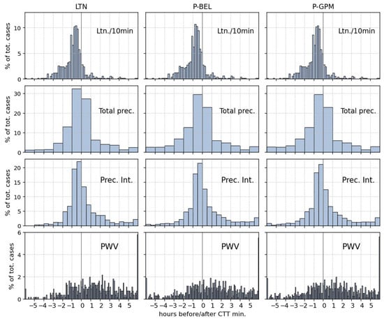 Taking the analysis further, Figure 14 shows the distribution of the time before or after the maximum lightning strikes; precipitation and PWV occur with respect to the CTT min. This clearly indicates that the majority of lightning occurred within 1 or 1/2 h before the CTT min, while the precipitation often reached its maximum in the hour before both total precipitation and the GPM precipitation intensity. It is a different story when looking at the distribution for PWV. There is no clear pattern. The low percentages of cases for each bin, which represents a 5 min interval for the PWV, indicate that there is not an obvious relationship between convective development and water vapor convergence, i.e., d/dt (PWV), contrary to the relationship observed by [11]. The steady increase and decrease in the average behavior of PWV observed in Figure 12 can be explained by the fact that there is no clear, consistent PWV behavior for all events. When observing each event individually, the PWV reached its peak at various points throughout the 2 h before the CTT min and 6 h after the CTT min, indicating that maximum PWV does not occur at the same time as the development of deep convection, indicated by the CTT min.
