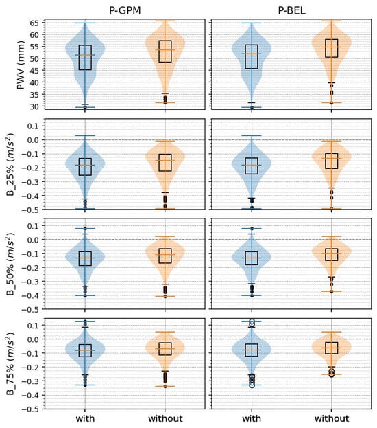 Violin plots superimposed on box-and-whisker plots for PWV and the deep-inflow buoyancy with 25% (B_25%), 50% (B_50%), and 75% (B_75%) entrainment weights. The dots indicate outliers of the box-and-whisker plot; black lines separate the plots for non-convective events and deep-convective events from the plots of the various deep-convective intensities.