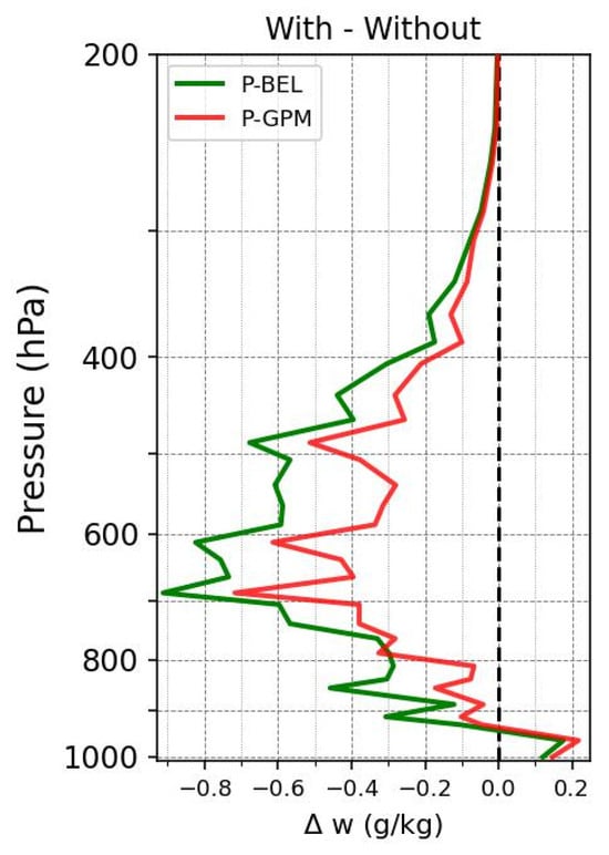 The difference in average mixing ratio from the daily radiosondes (12Z) between deep-convective days with lightning and deep-convective days without lightning for P-BEL and P-GPM. The dashed line indicates 0 g/kg difference.