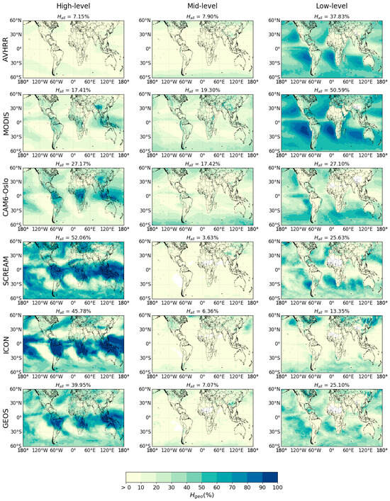 Cloud types at the same height are combined to obtain high-, mid-, and low-level clouds such that ICON and GEOS, which do not provide COT, can be included in the comparison. The relative frequency of occurrence (calculated with Equation (4)) refers to CTP > 680 hPa for low-level clouds, 440 hPa < CTP ≤ 680 hPa for mid-level clouds, and CTP < 440 hPa for high-level clouds, and it shows notable differences across datasets. AVHRR and MODIS retrieve a higher fraction of low-level clouds ( and , respectively) compared to mid- ( and ) and high-level clouds ( and ). In contrast, most models exhibit a larger proportion of high-level clouds ( ranging from to ) than low-level clouds ( ranging from to ). Despite all these differences, which may also be related to the filter applied to COT for the cloud top definition used in AVHRR, MODIS, and CAM6-Oslo, the datasets analyzed indicate consistent spatial patterns in the vertical distribution of clouds. As shown in Figure 1, low-level clouds occur predominantly over oceanic regions, whereas clouds at medium and high altitudes are distributed over both land and sea, in agreement with previous findings [43,45,46,60]. More specifically, clouds at medium and high levels are most frequent in the extratropical regions and around the Intertropical Convergence Zone (ITCZ), which are areas often subject to synoptic- and mesoscale events. In contrast, low-level clouds are primarily observed over the oceans, particularly along their eastern boundaries, where they form below a capping inversion created by the atmospheric subsidence over low sea surface temperatures.