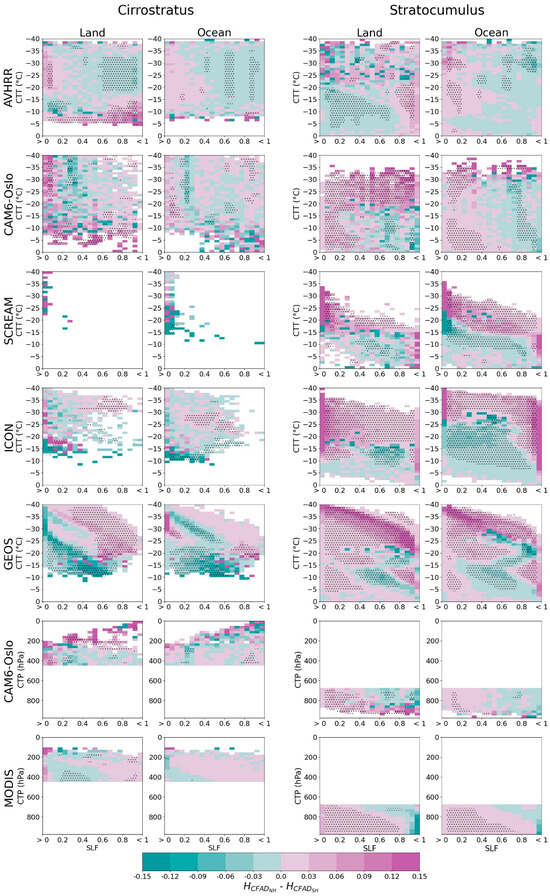 Figure 4 shows, for all datasets, the hemispheric contrast for continental and maritime regions for only cirrostratus and stratocumulus clouds, which we found to generally be the most frequent cloud types in the mixed-phase for high- and low-level clouds, respectively (Table S1). An example of derivation of these difference plots between CFAD-like histograms is shown in Figure S6 for AVHRR.