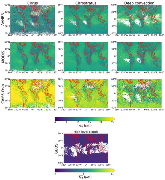 The observational datasets (AVHRR and MODIS) show large differences in both and . This may be due to the use of only the 3.7 µm channel in MODIS to retrieve cloud optical properties, as well as the combination of daily time frames of Terra and Aqua observations to provide cloud-top-related parameters at the final 1° × 1° spatial resolution. Previous validation studies including AVHRR (e.g., [6,18]) have shown the strong performance of this dataset compared to others derived from passive and active satellite sensors. In addition, from AVHRR is closer to previous satellite studies (ranging from to for afternoon satellites; ref. [59]) than MODIS. For these reasons, we subsequently focus on the observational data from AVHRR and using the MODIS dataset for its intended comparisons with COSP outputs from CAM6-Oslo.