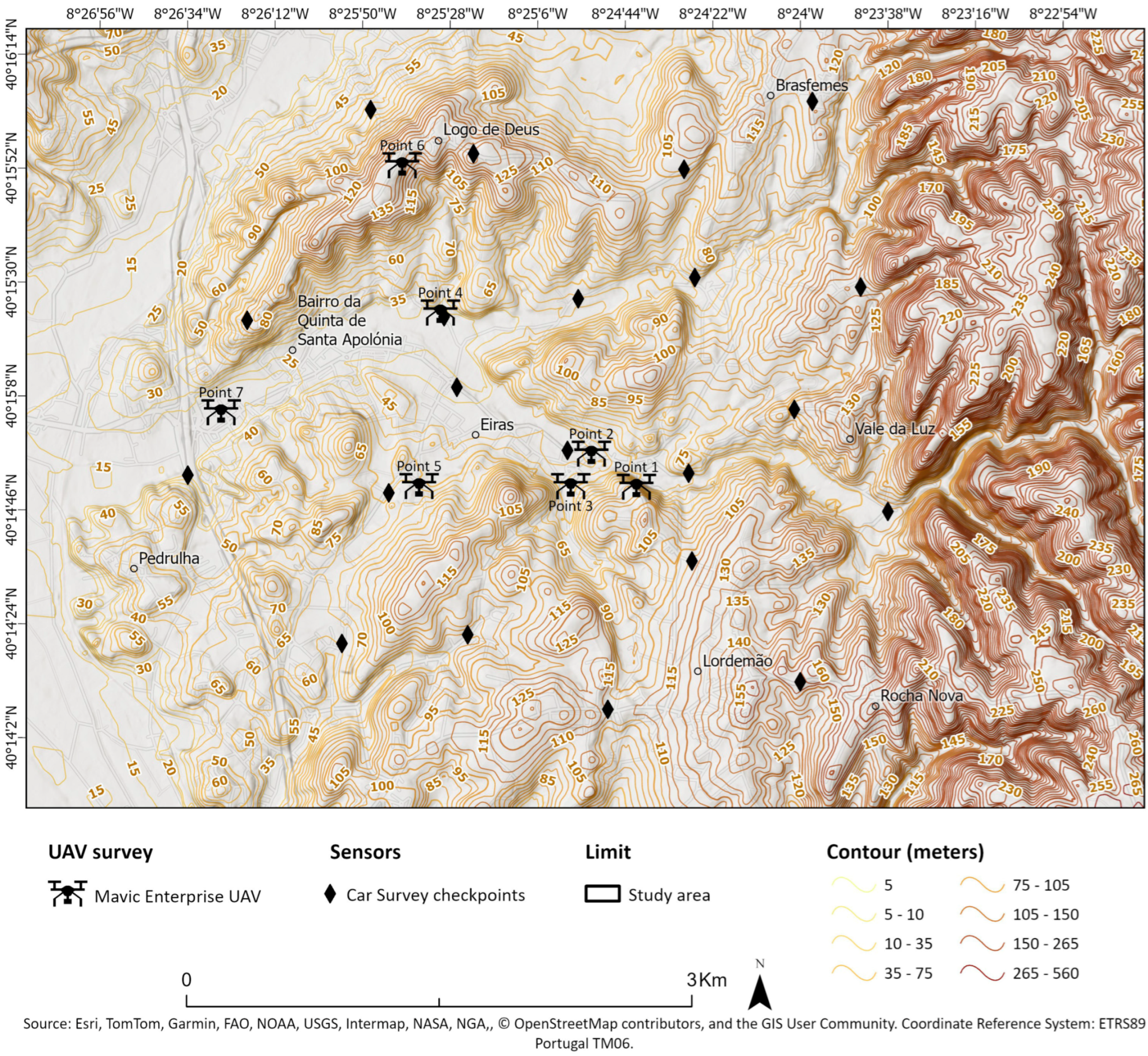 Figure 2) reflects a mix of urban and peri-urban development. The western end of the valley (a relatively flat sector, including the southern part of the valley plain) is dominated by commercial areas and housing developments. In the eastern portion of the valley, up to the village of Eiras, land use is primarily low-density residential (single-family homes). There are also a few industrial zones, mainly logistics and commercial warehouses in Eiras and nearby Pedrulha. Notably, some older manufacturing industries persist in the area, which emit atmospheric pollutants; under cold-air pool conditions, these emissions could accumulate beneath the temperature inversion, exacerbating local pollution problems. In contrast, the steep slopes of the Coimbra Marginal Massif on the east side of the valley remain largely forested (pine and eucalyptus), owing to the terrain’s gradient and less intensive human use.
